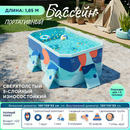 Складной детский плавательный бассейн домашний 1.85 м голубой с сине-оранжевыми вставками - это многофункциональный надувной комплекс, который станет отличным дополнением к вашему дому или дачному участку.