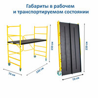 характеристики: Максимальная рабочая высота - 3, 8 м Максимальная высота установки опор - 1,5 м Диапазон высот установки опор - 40, 60, 90, 120, 150 см Масса всей конструкции - 43 кг. (две коробки по 17 кг и 26 кг соответственно) Размеры в сложенном виде(дшв), м - 1,5х0,7х0,2 Рамзмеры в рабочем положении(дшв), м - 1,5х0,7х1,5 Конструкция выполнена из стали с полимерным покрытием. Для удобства транспортировки по объекту на раме предусмотрены колеса со стопорами. Металлические опоры имеют противоскользящее покрытие, что сделает работу мастера максимально комфортной и безопасной! Комплектация Несущая складная рама, две металлические опоры, 4 колеса