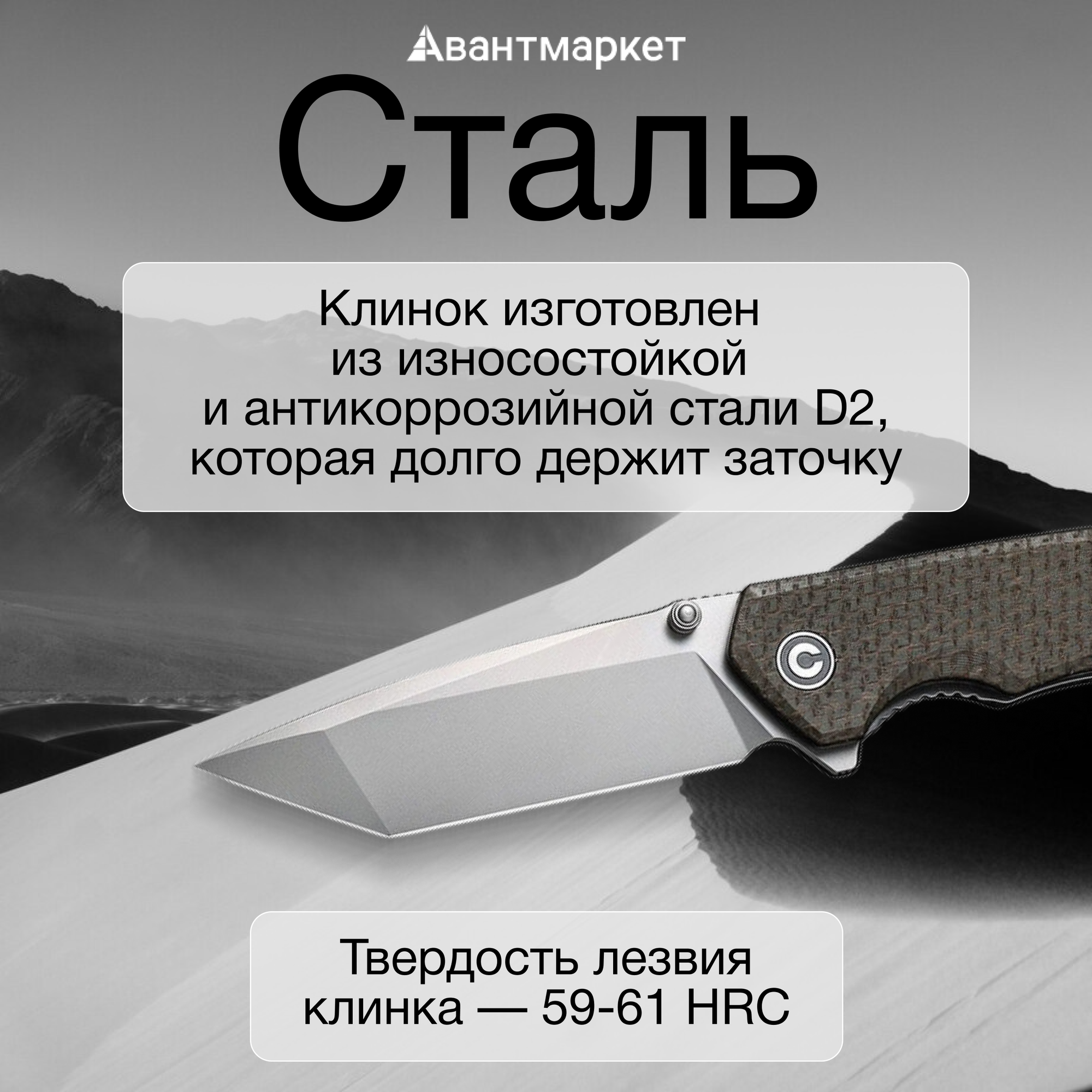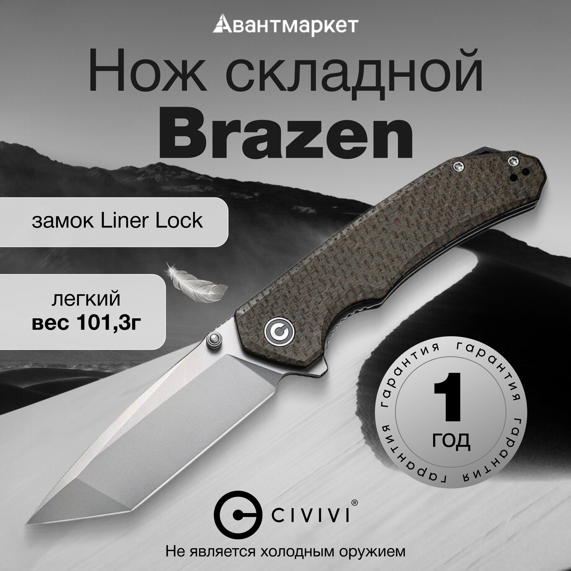 CIVIVI Brazen сталь D2, рукоять G10 черная: Отличительная особенность ножа Civivi Brazen - форма клинка Tanto, что с японского переводится как “короткий меч”. В стандартных ножах Civivi чаще выбирают форму клинка Drop Point. В отличие от “сужающегося к концу drop point, Tanto держит свою “массивность” до конца острия, что повышает колющие свойства лезвия.