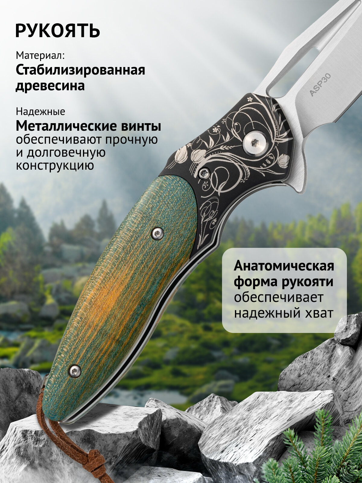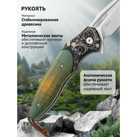 Рукоять – комфорт и уверенность: Рукоять ножа изготовлена из стабилизированной древесины, которая не только выглядит великолепно, но и обладает исключительными эксплуатационными характеристиками. Эта древесина прошла специальную обработку, которая повышает её прочность, износостойкость и устойчивость к влаге. Даже в самых сложных условиях – будь то проливной дождь, мороз или работа в перчатках – вы будете ощущать надежный и комфортный хват. Текстура рукояти обеспечивает отличное сцепление с рукой, предотвращая скольжение и обеспечивая максимальный контроль над ножом. Это особенно важно при выполнении точных работ или в условиях недостаточной освещенности.