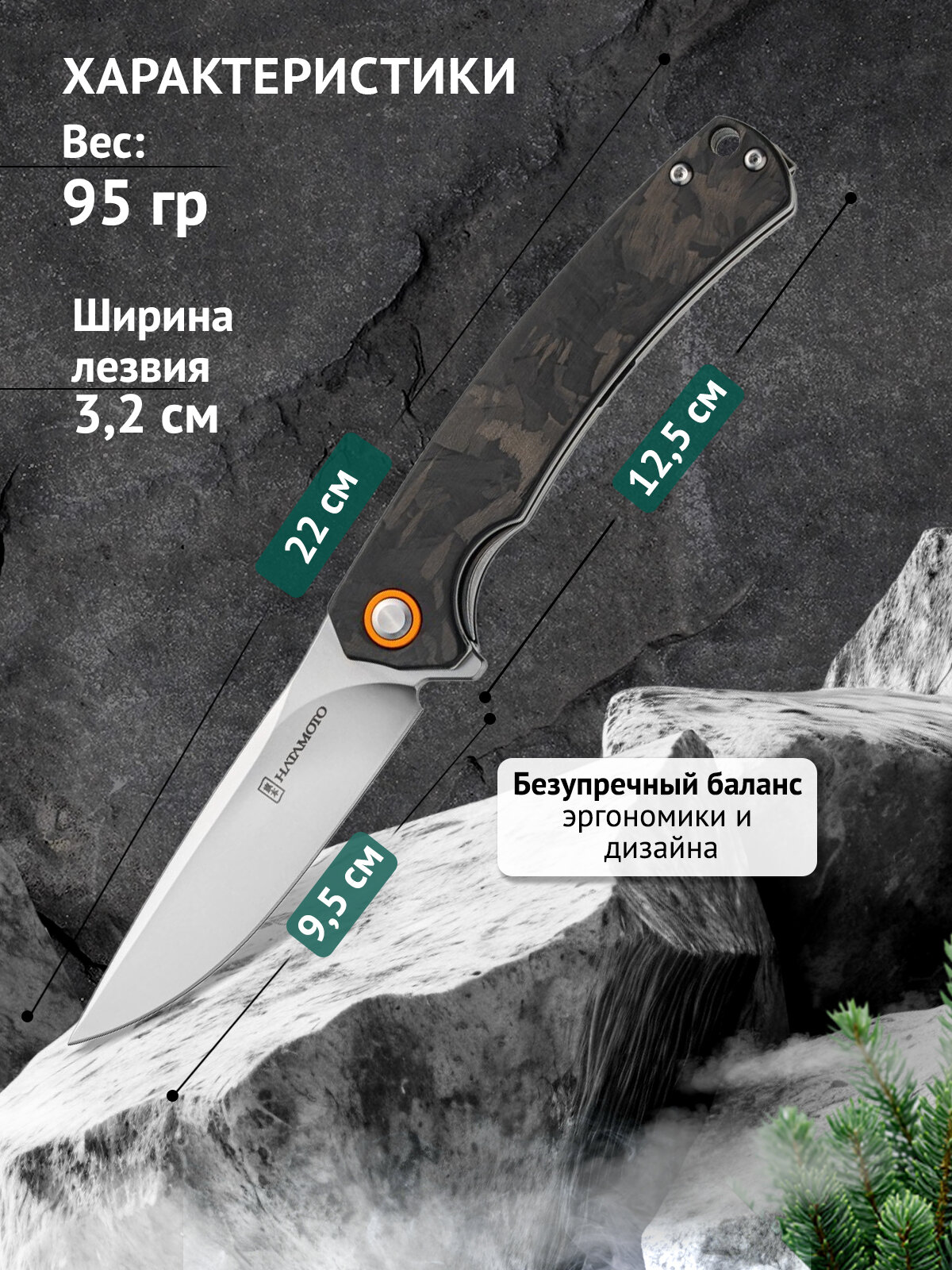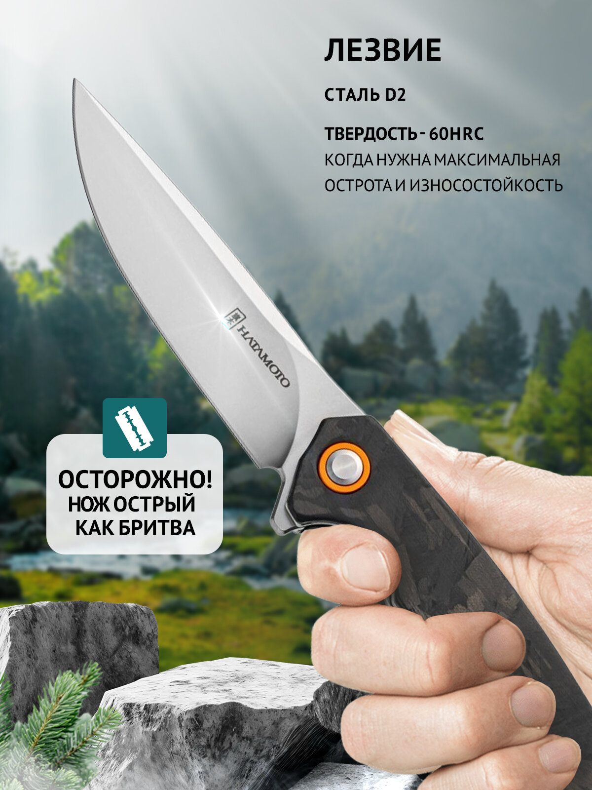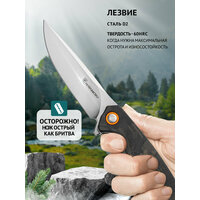 HFK-2464 Обновленная версия популярной модели с клинком из инструментальной стали D2 длиной 9,5 см и рукоятью из углеродного волокна. При весе всего 95 грамм этот нож невероятно легок, но при этом сохраняет все преимущества стали D2 - исключительную износостойкость и способность долго сохранять заточку (твердость 60 HRC). В рабочем состоянии длина ножа составляет 22 см, обеспечивая хороший рычаг при работе, а в сложенном - компактные 12,5 см.