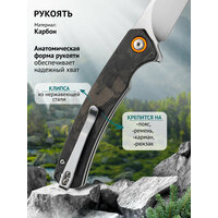 Лайнер-лок гарантирует безопасность при работе, надежно фиксируя клинок в открытом положении. Двухсторонняя клиновидная заточка делает нож универсальным инструментом для различных задач. Рукоять из углеродного волокна обеспечивает надежный хват в любых условиях.