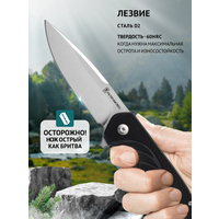 В рабочем состоянии нож имеет длину 21 см, обеспечивая удобный хват и хороший контроль при работе. Лайнер-лок гарантирует безопасность, надежно фиксируя клинок в открытом положении. Двухсторонняя клиновидная заточка делает нож универсальным инструментом для различных задач - от тонких работ до разрезания толстых веревок и строгания дерева.
