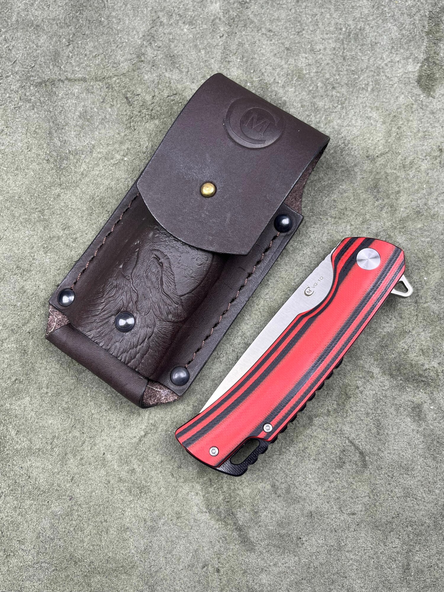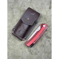 Рукоять ножа выполнена из прочного G10 в черно-красной расцветке, которая не только радует глаз, но и обеспечивает надежный захват. Такой материал обеспечивает отличное сцепление даже в дождливую погоду, что делает использование инструмента комфортным и безопасным. Компактные размеры и малый вес делают этот предмет удобным для транспортировки и хранения.
