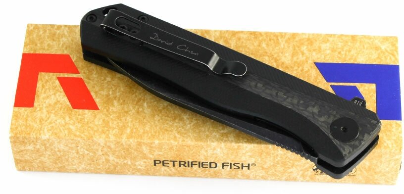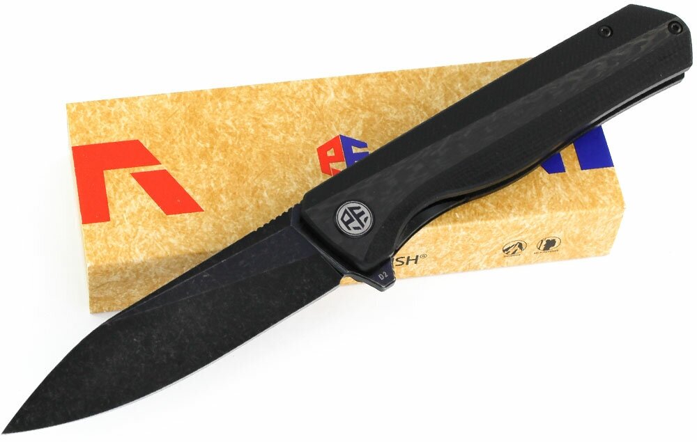 Модель: PF818 Общая длина: 205 мм Длина клинка: 90 мм Толщина обуха: 3,5 мм Ширина клинка: 24 мм Марка стали: D2 Обработка лезвия: Black stonewash Материал рукояти: Carbon Fiber / G10 Обработка рукоятки: ЧПУ Твердость клинка: 59-60 HRC Система: Керамический шарикоподшипник Вес: 104 гр