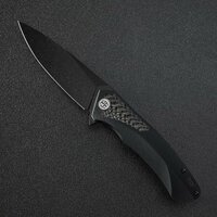Рукоять собрана на толстых стальных лайнерах, один из которых превращён в замок Liner-Lock, а в другом сделаны пять сквозных отверстий для снижения веса. На лайнерах закреплены накладки из стеклотекстолита G10 с качественной шлифовкой и наведением микрорельефа. С каждой стороны сделана вставка из углеродного волокна, и вот тут мы снова уходим в оттенки серого. Обе части идеально подогнаны друг к другу, из-за чего производят впечатление единого целого. Не имея насечек на краю, замок легко доступен даже в перчатках, так как с другой стороны предусмотрена выемка.