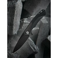 Для производства ножей торговая марка Petrified Fish часто задействует дизайнера Дэвида Чена, и всякий раз это сотрудничество вызывает у найферов только положительные эмоции. Могучая модель Pub PF838 исключением не стала, собрав вал хвалебных отзывов. Это нож с тёмным клинком, обработанным по технологии Black Stonewashed. На первый взгляд эта версия выглядит исключительно чёрной, однако тут вполне умещаются 50 оттенков серого, если знать, куда смотреть.