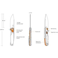 Имеет ножевой замок Frame lock, что, по сути, является разновидностью линейного замка Liner-lock. Это простая конструкция, надёжная, включает в себя запирающую пластину, которая в свою очередь является частью другой пластины, образующей ручку изделия. Для комфортного ношения модели предусмотрена клипса. Она позволяет прикрепить нож к карману, зафиксировать его на поясе или прицепить, например, к рюкзаку. Весит такая красивая, прочная и эффективная модель 140 грамм. Производители дают гарантию на нож – 5 лет.