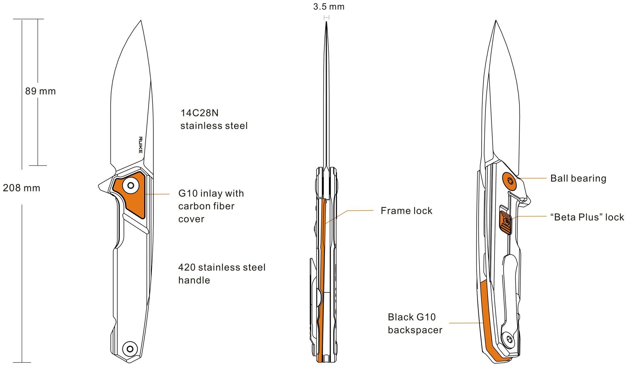 Данная модель ножа предназначена для тех, кто в восторге от варианта Ruike M875-TZ, но при этом предпочитают лезвие из стали 14C28N и ручку из сплава 420. Эффектный складной нож, на ручку нанесена гравировка в виде орнамента с жимолостью. Этот цветок традиционно считается символом добрых пожеланий. В модели имеется защитный механизм BetaPlus, который предотвращает случайное закрытие лезвия. Компактное изделие пригодится туристам, путешественникам, и вполне подходит для ежедневного ношения. Очень удобный, лёгкий, красивый нож.