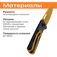 Тип: Складной ; Страна: США ; Вид: Карманный ; Назначение: На каждый день ; Тип клинка: Drop-Point ; Материал клинка: CPM S35VN ; Твердость стали (HRC): 60 — 62 ; Тип обработки клинка: Titanium Nitride ; Тип замка: AT-XR Lock ; Длина клинка: 70 мм ; Толщина обуха: 2 мм ; Материал рукояти: Карбон ; Общая длина: 160 мм ; Вес: 34 г ; Цвет: Carbon ; При толщине 6,5 миллиметра и весе всего 34 грамма SOG Ultra XR отличается выразительным дизайном и легкими высококачественными материалами, включая клинок из нержавеющей стали CPM S35VN и рукоять из углеродного волокна. Замок XR Lock обеспечивает плавное двустороннее открывание одной рукой и надежную фиксацию клинка в открытом положении. Клипсу для кармана из титана можно использовать как зажим для денег. Материал клинка — CPM S35VN — одна из самых качественных и самых популярных сталей ножевого дела. Она в 1.5 раза превосходит, достаточно неплохую сталь 440с по способности держать заточку, и 3.5 раза, ее же, по прочности. Спуски на клинке вогнутые. Часто они используются на ножах, где требуется аккуратный, бритвенный рез. Но с другой стороны для грубой работы такие клинки не предназначены. Рукоять изготовлена из карбона. Карбон это довольно дорогой, но невероятно прочный материал. Он очень легок и не боится влияния химических реагентов. Переплетения карбоновых нитей, вырисовывают уникальную текстуру, поэтому карбон прочно обосновался в сегменте аксессуарных и джентльменских ножей. Стоит отметить, что несмотря на то, что карбоновые нити почти не возможно порвать, этот материал плохо переносит удары, а так же прямое воздействие солнечных лучей. Длина клинка:70 мм Длина рукояти: 90 мм Длина ножа: 160 мм Толщина обуха:2,0 мм Материал клинка: CPM-S35VN Материал рукояти: Карбон Изготовитель: SOG, США Вес:34 гр