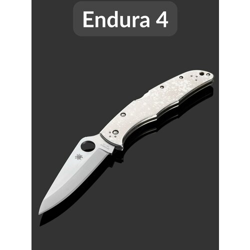 Для Spyderco Endura 4 базовой выбрали японскую сталь VG-10. Производится нож тоже в Японии. Каплевидный профиль Drop Point считается одним из самых крепких для острия, но владельцы Endura 4 советуют всё же не нагружать кончик клинка из-за тонкого сведения. Матовость клинку придали сатинированием (шлифовка направленными штрихами, делающая поверхность похожей на ткань). Вблизи рукояти находится фирменное круглое отверстие Thumb Hole, позволяющее открывать нож одной рукой.