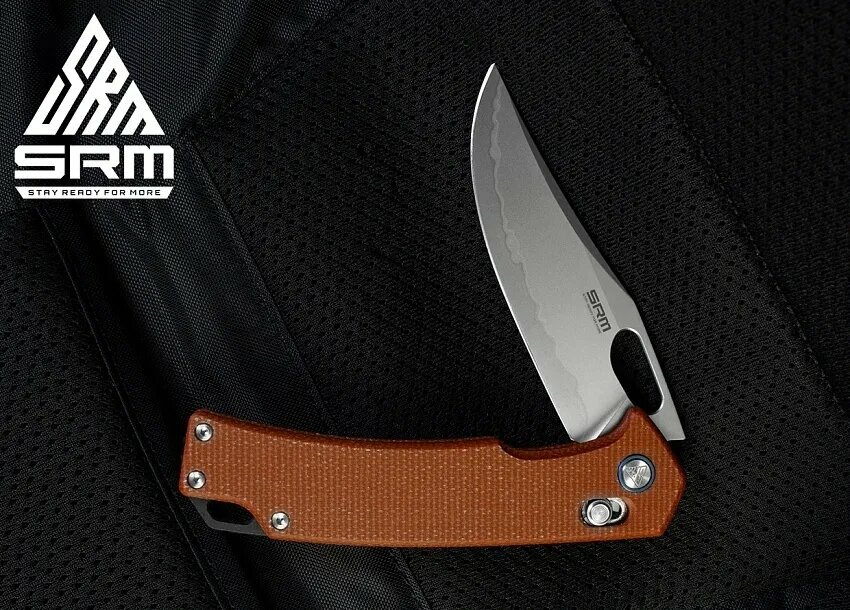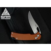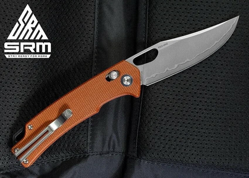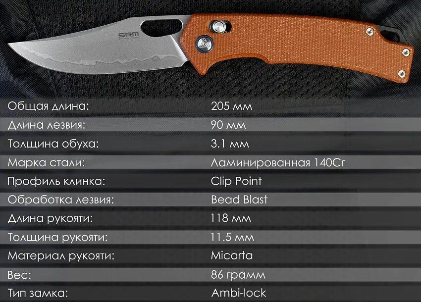 Складной нож SRM 9203-MN2 — это удобный и практичный нож для ежедневного ношения (EDC), но также подойдет и для грубой работы. Сердцевина клинка выполнена из твердой углеродистой стали марки 140Cr, ламинированной обкладками из нержавеющих сталей. Производитель уверенно заявляет, что по характеристикам композит 140Cr не уступает премиальной стали CPM-S35VN. Сплав обладает высокой твердостью, устойчив к коррозии и выкрашиванию. Помимо режущих качеств, клинок обладает уникальным рисунком. В обухе с характерным прогибом к зауженному лезвию сразу узнается брутальный профиль Clip-Point. Благодаря тонкому острию и длинной режущей кромке, подобная форма лезвия будет одинаково эффективной, как для прокалывания, так и резки. Рукоять ножа выполнена из Микарты - одного из лучших материалов для изготовления рукоятей ножей. Micarta – представляет собой композит из слоев волоконного материала, запеченного с эпоксидными смолами под высоким давлением. Материал очень прочный и износоустойчивый, не боится сколов и даже экстремально высоких температур. Кроме того, рукоятки из микарты очень легкие, приятные на ощупь и не скользят в руке даже под водой. Фиксацию лезвия выполняет замок Ambi Lock. Работа замка основывается на запирании лезвия подпружиненным сквозным ригелем, установленным перпендикулярно клинку в сквозную прорезь на рукояти. Главное преимущество замка Ambi Lock – это открытие лезвия любой рукой с минимальными усилиями. Лезвие буквально выскакивает из рукоятки, при этом надежно фиксируясь в открытом виде. Наличие темлячного отверстия и двухпозиционной клипсы Ambi Clip позволяет комфортно разместить нож на одежде или снаряжении.