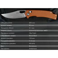 Характеристики: Общая длина: 205 мм Длина лезвия: 90 мм Толщина обуха: 3.1 мм Марка стали: Ламинированная 140Cr Твердость по Роквеллу: 58-60 HRC Профиль клинка: Clip Point Обработка лезвия: Bead blast Длина рукояти: 118 мм Толщина рукояти: 11.5 мм Материал рукояти: Micarta Цвет рукояти: коричневый Вес: 86 грамм Тип замка: Аmbi-lock Метод открытия: подпальцевое отверстие Назначение: EDC ежедневное ношение; туризм; охота Бренд: SanRenMu Hardware Technology Страна производства: Китай