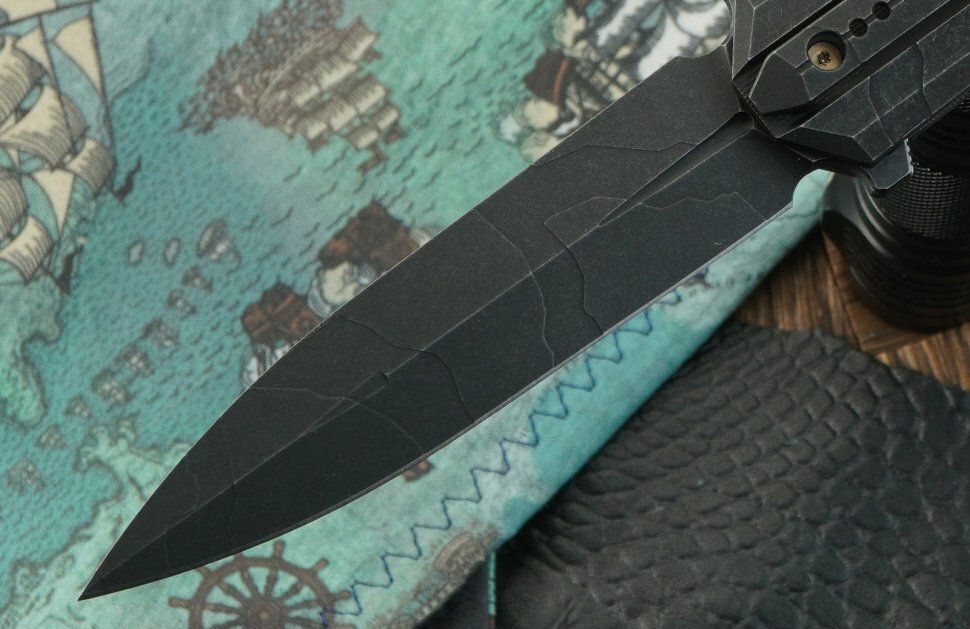 Хищный, кинжальный клинок сделан из порошковой премиум-стали CPM 20CV. Она знаменита своим агрессивным резом и высокой ударной вязкостью для работы в экстремальных условиях. На серийных ножах CPM 20CV встречается не так уж и часто. Клинок имеет обработку black stonewash, выглядящую как искусственно состаренное покрытие чёрного цвета. Это очень эффектный и практичный тип обработки поверхности: он скрывает в своей структуре мелкие царапины, получаемые во время работы, и повышает коррозионную стойкость клинка.