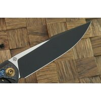 Нож открывается за плавник, что увеличивает полезную длину клинка (шпеньков нет). Когда нож раскрыт, плавник становится своеобразной мини-гардой. Осевой узел выполнен на подшипниках с керамическими шариками — механика прекрасная, клинок просто «летает». Рукоять формируется плашками из карбона и титанового сплава, что позволило реализовать замок Frame Lock, являющийся, по сути, более надёжной модификацией обычного линейного замка за счёт увеличенного пятна контакта с пятой клинка.