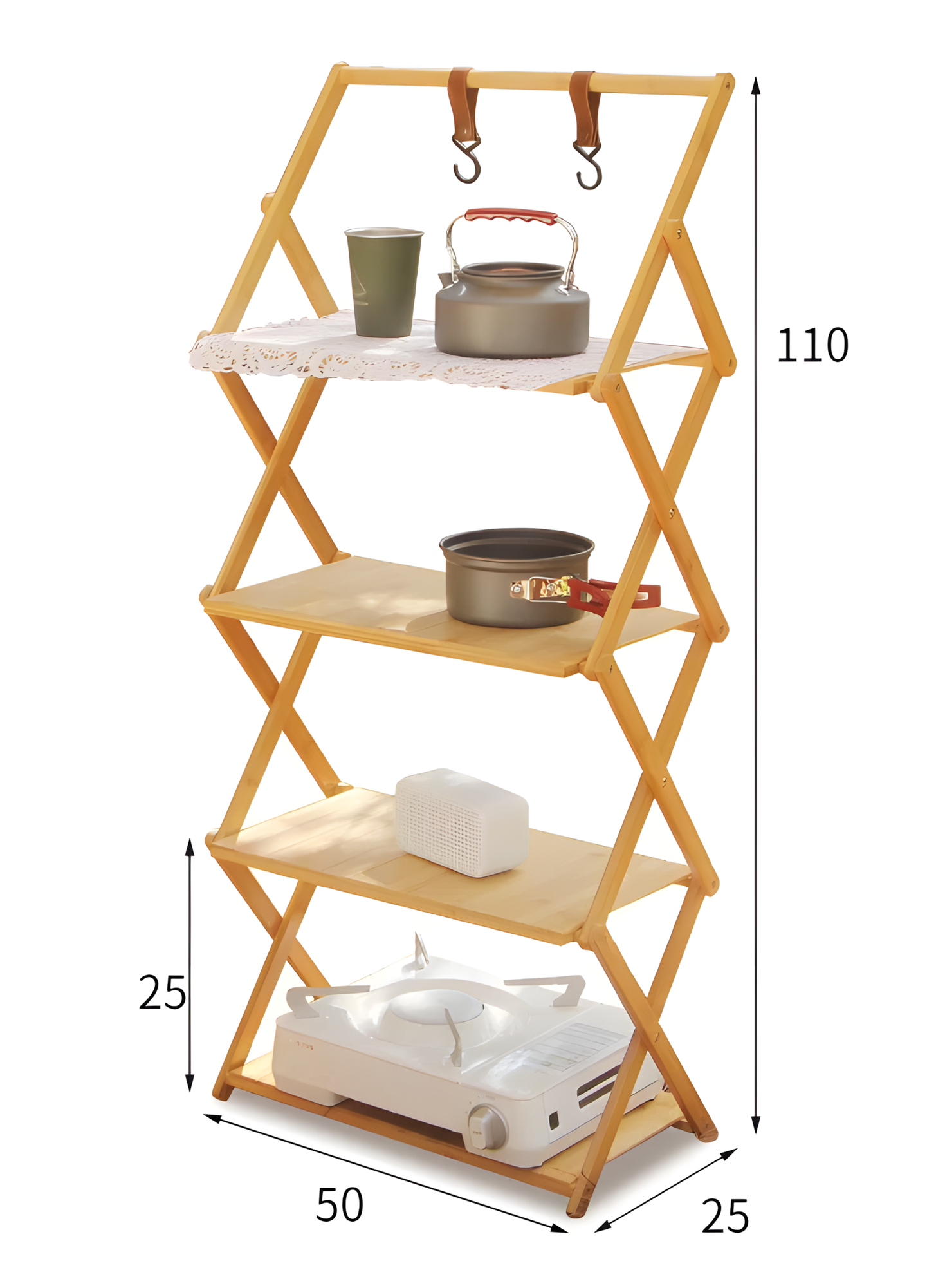 Складной туристический стеллаж из бамбука, 4 полки и перекладина, натуральный, 110х50 см