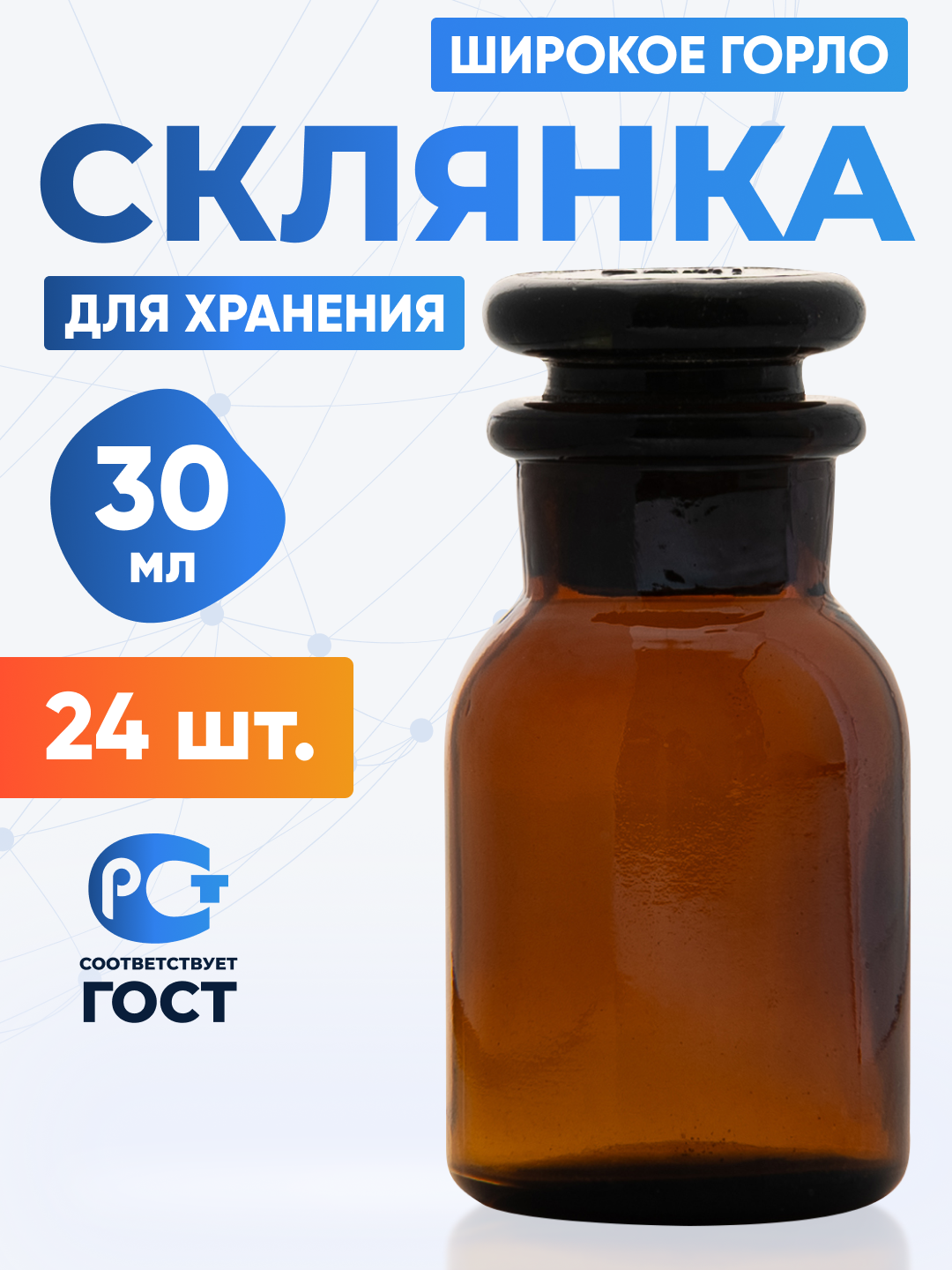 Склянка (штанглас) 30 мл (24 шт) из темного стекла с широкой горловиной и притертой пробкой для реактивов СТШ-30: сравнение цен, характеристики, фото, актуальное наличие и цены.