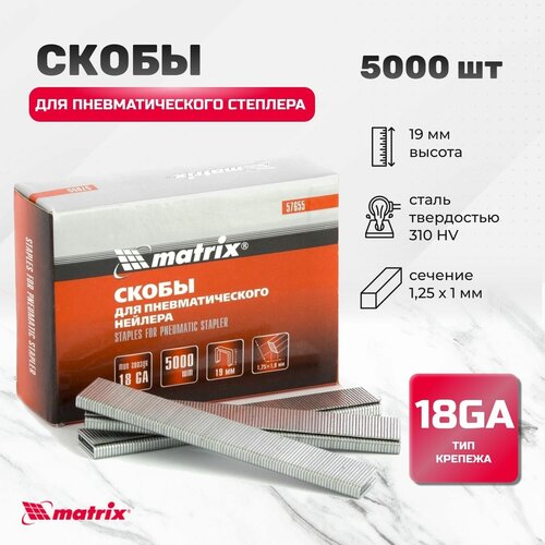 Скобы Matrix 57655 типа 18GA, 5000 шт. в упаковке, — крепежные элементы сечением 1,25 х 1,0 мм, длиной 19 и шириной 5,7 мм, предназначенные для установки в строительный пневматический степлер. Применяются для сборки деревянных каркасов, ремонта кровли, монтажа окон и дверей, фиксации утеплителей.