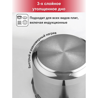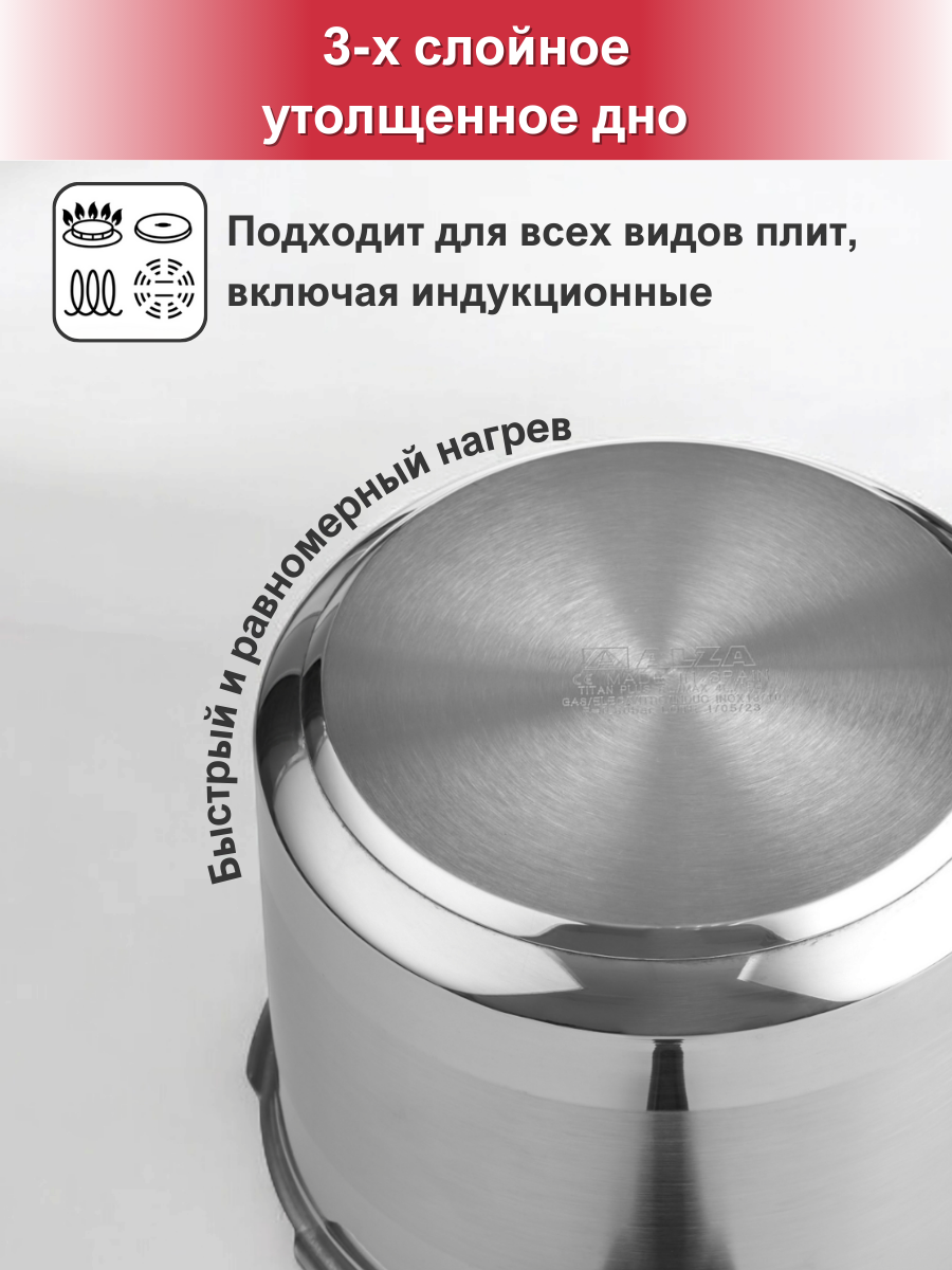 При производстве скороварок и посуды ALZA использует один и тот же принцип: утолщенное дно представляет собой тройной “бутерброд” сталь-алюминий-сталь, изготовленный методом термодиффузии. Это позволяет достичь быстрого и равномерного нагрева изделия, особой прочности соединения дна и корпуса посуды и усиливает антипригарные свойства посуды. Подходит для всех видов плит, включая индукционные, использовать посуду в духовке нельзя.