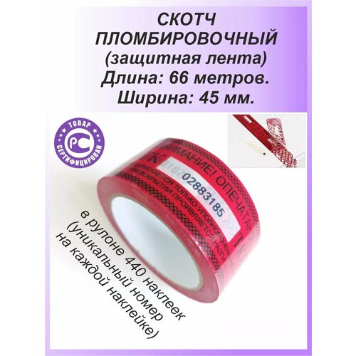 В случае вскрытия проявляется скрытый текст на поверхности опломбированного предмета и на верхнем слое защитной клеевой ленты. Лента разделена на отрезки с помощью перфорации, позволяющей отделять от ленты отдельные номерные наклейки. Каждый отрезок ленты имеет свой уникальный номер. В рулоне 440 отрезков. Применяется везде, где можно применить упаковочную ленту с необходимостью учета и информирования о вскрытии. Характеристика Цвет: красный; Материал: полиэстер + акриловый клеящий слой; Текст на перфорированном рулоне: «SEALED DO NOT REMOVE» («НЕ вскрывать опломбировано») + нумерация; Лента имеет перфорацию через 150 мм; Каждый отрезок пронумерован, что позволяет использовать их как отдельные пломбы-наклейки; Диапазон рабочих температур: -30ºС … +100ºС; Рулон 66 м; Ширина ленты: 45 мм; Упаковано в рулоны.