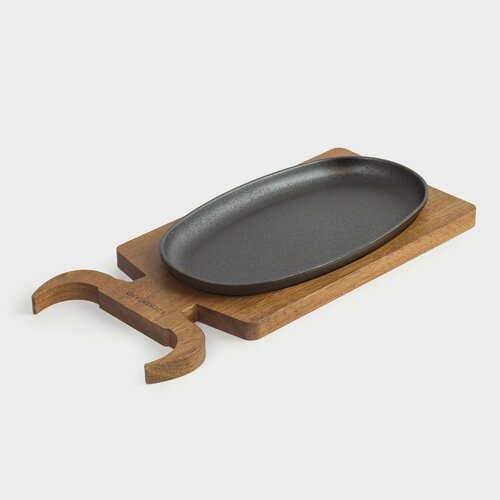 Сковорода, на подставке. Размер: сковорода - 24х14 см, подставка - 15х33 см. Материал: сковорода - чугун с покрытием; подставка - дерево акации. Изделие из чугуна подходит для использования на всех типах плит, в том числе индукционных. Чугунную посуду можно использовать в духовке - максимальная температура 280°С. Рекомендации по использованию и уходу: перед первым применением промыть чугунную посуду и высушить, далее смазать внутреннюю поверхность растительным пищевым маслом и прогреть в течение нескольких минут на медленном огне. После остывания удалить остатки масла сухой тряпкой. Рекомендуется мыть вручную с применением мягких моющих средств. Не использовать для ухода абразивные чистящие средства и жесткие губки. Нельзя мыть в посудомоечной машине. Подставку протирать влажной тряпкой.