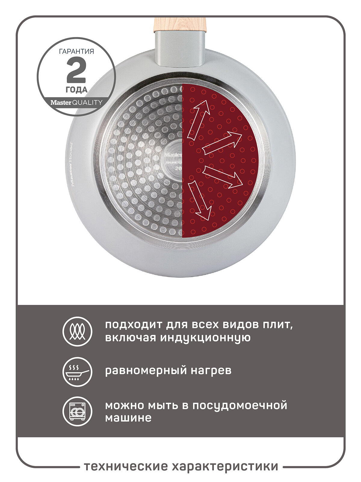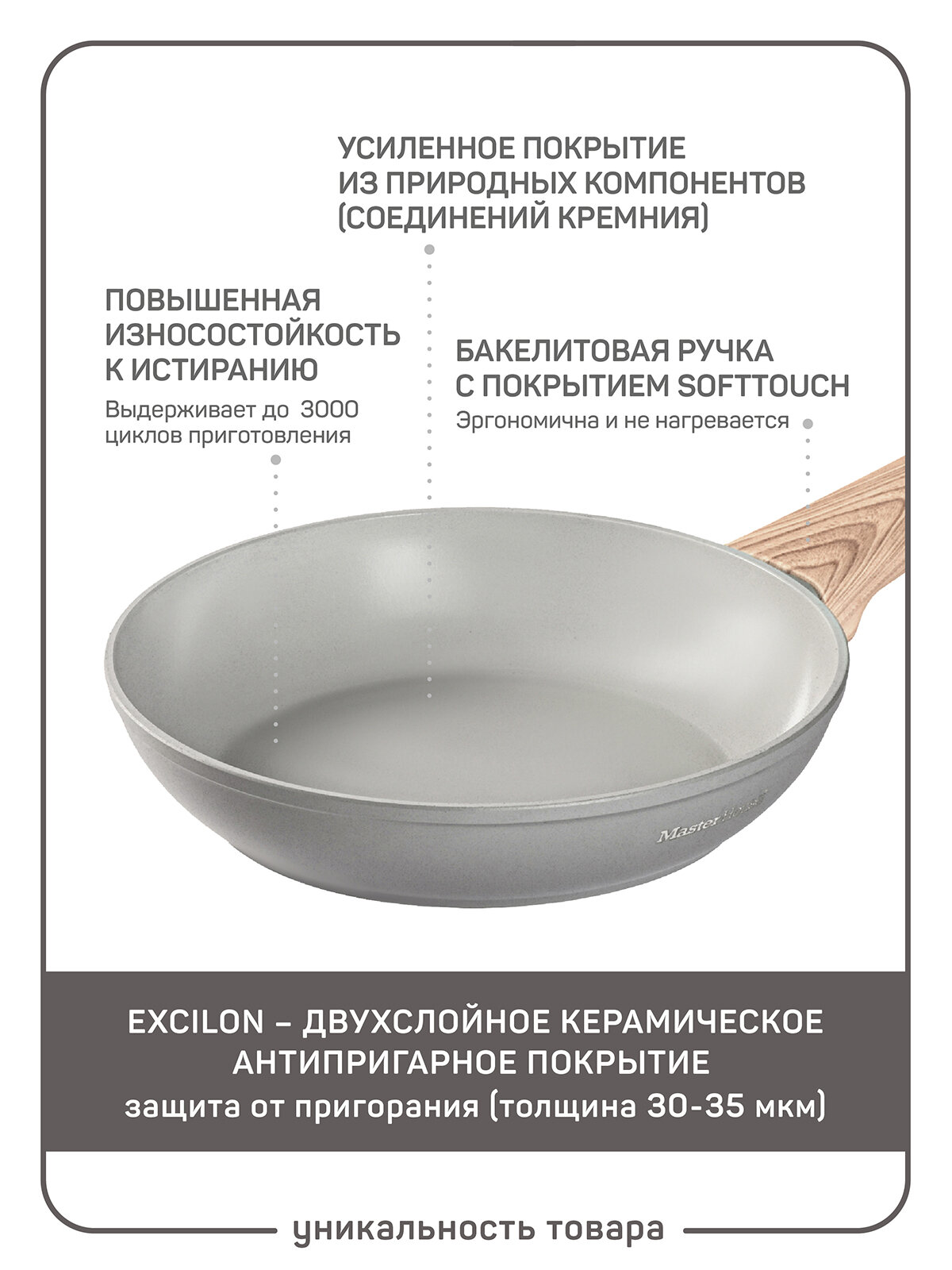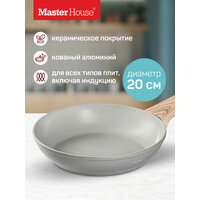 Сковорода Master House Рикардо. Кованый алюминий. Бакелитовая ручка с мягким напылением. Двухслойное керамическое антипригарное покрытие Excilon 30-35мкм. Диаметр по верху (крышка): 20см, высота бортика 4.2мм, толщина дна 2.6 мм. Выдерживает более 3000 циклов на истирание. Подходит для всех видов плит, в том числе для индукционной.