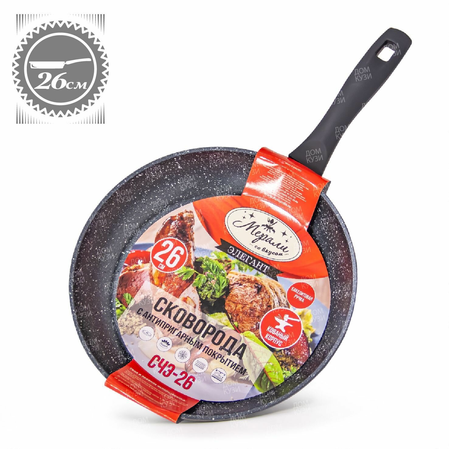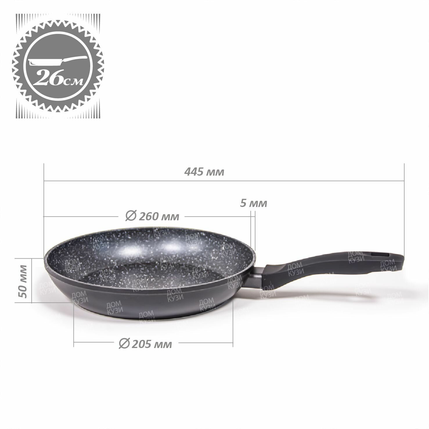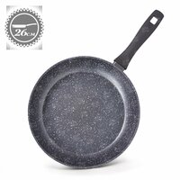 Сковорода без крышки Мерали 26 см с антипригарным мраморным покрытием. Самый популярный и незаменимый предмет на кухне – это классическая глубокая литая сковорода с антипригарным покрытием. Литая посуда равномерно прогревается и достаточно долго сохраняет тепло, она не такая тяжелая, как чугунная сковорода. Подходит для частого применения, идеальна для жарки и тушения, для приготовления курицы, фарша, филе, котлет, мяса, картошки, сырников, овощей, драников, печени, грибов – и все это при возможности использования минимального количества масла или совсем без него. Долговечная глубокая сковорода 26 см, толщина стенок 4 мм, толщина дна 5 мм. Такие характеристики означают, что корпус изделия не подвержен деформации и будет служить долгие годы при условии правильной эксплуатации. Благодаря толстому дну и стенкам продукты в сковороде равномерно прогреваются, а также сковорода сохраняет остаточное тепло в течение длительного времени. Сковорода абсолютно безопасна для здоровья, на ее поверхность нанесено высококачественное минеральное покрытие на водной основе. Современная 5-ти слойная система покрытия защищает продукты от пригорания. Антипригарное покрытие на водной основе не содержит PFOA, это экологично и безопасно. Внешний вид сковороды напоминает камень гранит, этот рисунок наносится на базовое покрытие. Иногда можно встретить название «мраморная крошка», этот рисунок придает индивидуальность и стильный вид современной посуде для приготовления. Антипригарное покрытие отличается особой износостойкостью и превосходными антипригарными свойствами, рассчитано на интенсивное использование в течение длительного срока. Можно готовить на любой плите. Однако, для индукционной плиты понадобится специальный адаптер. Эргономичная ручка сделана из бакелита, этот материал не нагревается в процессе приготовления и прихватки не понадобятся при условии правильного расположения сковороды на плите. В данной модели ручка не съемная. Оптимальная высота бортов делают эту посуду идеальной для приготовления блюд, в которых достаточно много жидкости или объема. Это может быть овощное рагу, заправка для пасты, соусы, жареная картошка, плов, паэлья. Прекрасный подарок на любой Праздник: 14 Февраля, 23 Февраля, 8 Марта, День Рождения для мамы, папы, дедушки, бабушки, сыну, дочери, мужу, жене, девушки, парня.