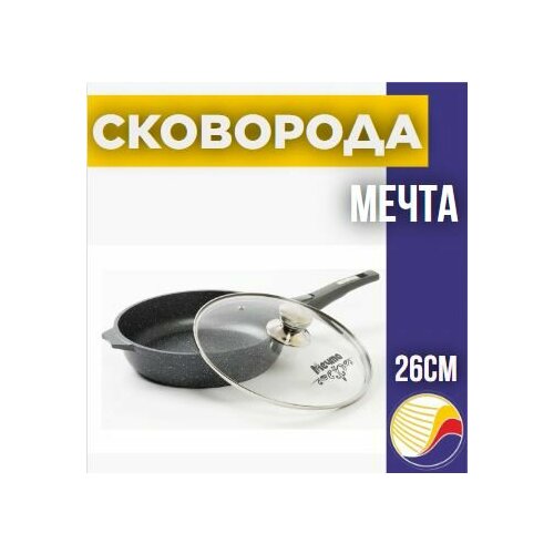 Сковорода Мечта Гранит со съемной ручкой и крышкой Диаметр: 26см. Цвет: серый. Для всех типов плит, кроме индукционных. Можно использовать в посудомоечной машине. Сковорода - это специфическая посуда, которая является незаменимой на кухне. В ней можно приготовить много интересных блюд: соусы, тушеное мясо и десерты. Сверхпрочное антипригарное покрытие отличается особой износостойкостью и превосходными антипригарными свойствами, рассчитано на интенсивное использование в течение длительного срока. Ресурс более 12000 циклов согласно проведенному тесту на износостойкость BS 7069:1988. Сковорода Гранит из литого высококачественного пищевого алюминия "Мечта" станет надежным помощником на вашей кухне. Посуда торговой марки мечта – это приятный и практичный подарок для любого случая! Посуда для кухни, посуда для приготовления, кухонная утварь - все это есть у тм Мечта.