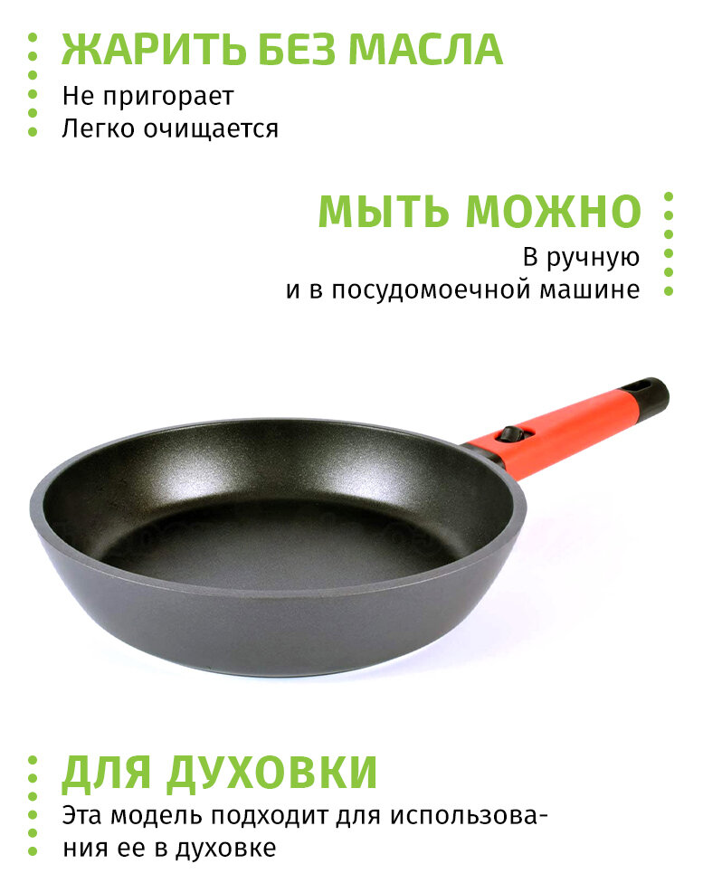 В сериях Gusta модели со съёмными ручками. Такие сковороды можно использовать не только на плите, но и в духовке. Также, их удобно мыть в посудомоечной машине и хранить, сняв ручку — в таком виде посуда будет занимать меньше места.