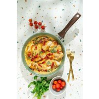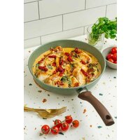 Ручка сковороды выполнена с имитацией дерева и имеет натуральный зеленый цвет, что создает приятную атмосферу на кухне.
