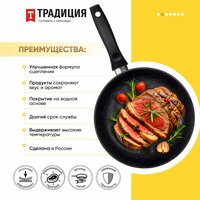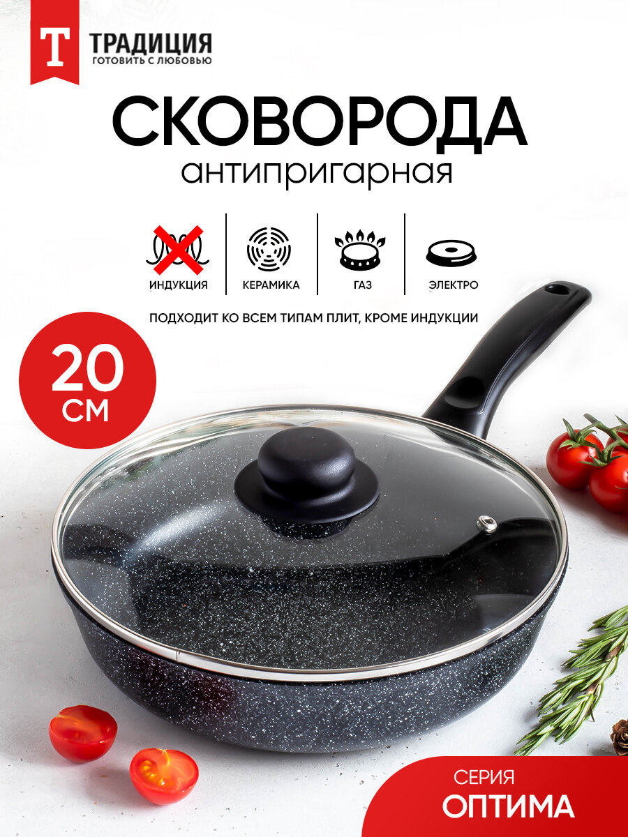 Самый популярный и незаменимый предмет на кухне – это классическая глубокая литая сковорода с антипригарным покрытием. Литая посуда равномерно прогревается и достаточно долго сохраняет тепло, она не такая тяжелая, как чугунная сковорода. Подходит для частого применения, идеальна для жарки и тушения, для приготовления курицы, фарша, филе, котлет, мяса, картошки, сырников, овощей, драников, печени, грибов – и все это при возможности использования минимального количества масла или совсем без него. Долговечная глубокая сковорода 20 см ТМ "Традиция готовить с любовью" сделана в России, толщина стенок 2,5 мм, толщина дна 5,0 мм. Такие характеристики означают, что корпус изделия не подвержен деформации и будет служить долгие годы при условии правильной эксплуатации. Благодаря толстому дну и стенкам продукты в сковороде равномерно прогреваются, а также сковорода сохраняет остаточное тепло в течение длительного времени. Сковорода ТМ "Традиция готовить с любовью" абсолютно безопасна для здоровья, на ее поверхность нанесено высококачественное минеральное покрытие на водной основе. Современная 5-ти слойная система покрытия защищает продукты от пригорания. Антипригарное покрытие на водной основе не содержит PFOA, это экологично и безопасно. Внешний вид сковороды напоминает камень гранит, этот рисунок наносится на базовое покрытие. Иногда можно встретить название «мраморная крошка», этот рисунок придает индивидуальность и стильный вид современной посуде для приготовления. Антипригарное покрытие отличается особой износостойкостью и превосходными антипригарными свойствами, рассчитано на интенсивное использование в течение длительного срока. Можно готовить на любой плите. Однако, для индукционной плиты понадобится специальный адаптер. Эргономичная ручка сделана из бакелита, этот материал не нагревается в процессе приготовления и прихватки не понадобятся при условии правильного расположения сковороды на плите. В данной модели ручка не съемная. Оптимальная высота бортов делают эту посуду идеальной для приготовления блюд, в которых достаточно много жидкости или объема. Это может быть овощное рагу, заправка для пасты, соусы, жареная картошка, плов, паэлья. Хорошую сковородку купить просто, ухаживать легко, её можно мыть в посудомоечной машине в режиме Eco (не выше 50 градусов) и использовать моющие средства с уровнем pH, близким к нейтральному (в диапазоне 6-8). К сковороде подойдет любая крышка диаметром 20 см, она не входит в комплектацию. Идеально подходят крышки из термостойкого стекла с пароотводом, она позволяет наблюдать процесс приготовления пищи. Полная ассортиментная линейка состоит из сковороды 20 см, 24 см, 26 см, 28 см, сковороды блинной 22 см для идеальных ажурных блинчиков. Также в продаже жаровни, казаны, сковороды со съемной ручкой, сковороды-гриль для идеальных стейков и овощей-гриль. Сковорода со съемной ручкой может служить в качестве формы для запекания, это экономия денег и места на кухне! Вы можете собрать собственный набор сковородок любого размера. Посуда для кухни – очень важная составляющая, которая подарит комфорт и уют, а посуда для приготовления – это то, чем мы пользуется почти ежедневно. Красивая и функциональная кухонная утварь служит прекрасным подарком на день рождения, юбилей, на Новый год, на свадьбу, на 8 мар