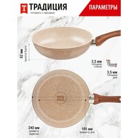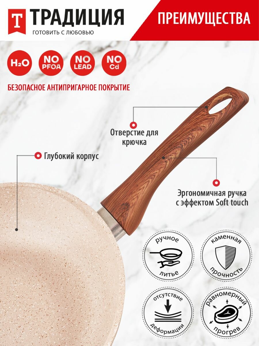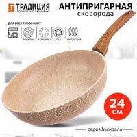 Нежная и хрупкая на вид, серия Миндаль удивит своей практичностью и безотказностью на кухне! Сковороды серии Миндаль обладают идеальными характеристиками для по-настоящему легкого и приятного приготовления все более здоровых блюд, не требующих добавления большого количества масла и жира. Толщина дна и стенок оптимальна, чтобы обеспечивать хорошую теплопроводность и равномерный нагрев, без утяжеления изделия. Многослойное антипригарное покрытие на водной основе не содержит PFOA не только безопасное, но и красивое. Посудой можно пользоваться несколько раз в день, поскольку сочетание достаточно толстого дна и современного покрытия обеспечивает более 5000 циклов приготовления. Благодаря удобной глубокой форме, она хороша для мяса, рыбы, курицы, овощей, грибов, а также блюд на основе круп. Можно готовить на всех варочных поверхностях, в том числе и индукционной. Приятным дополнением к удобному корпусу сковороды стала эргономичная ручка из термостойкого пластика с «бархатным» эффектом Soft Touch. Ручка не нагревается во время приготовления и лежит в руке, не выскальзывая. За сковородой достаточно просто ухаживать вручную, а также ее можно мыть в посудомоечной машине. Соберите собственный набор сковородок Миндаль любого размера. Посуда для кухни – очень важная составляющая, которая подарит комфорт и уют, а посуда для приготовления – это то, чем мы пользуется почти ежедневно. Отличный подарок на день рождения, юбилей, на Новый год, на свадьбу, на 8 марта, на новоселье и просто так!