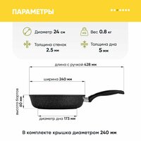 Самый популярный и незаменимый предмет на кухне – это классическая глубокая литая сковорода с антипригарным покрытием. Литая посуда равномерно прогревается и достаточно долго сохраняет тепло, она не такая тяжелая, как чугунная сковорода. Подходит для частого применения, идеальна для жарки и тушения, для приготовления курицы, фарша, филе, котлет, мяса, картошки, сырников, овощей, драников, печени, грибов – и все это при возможности использования минимального количества масла или совсем без него. Долговечная глубокая сковорода 24 см ТМ "Традиция готовить с любовью" сделана в России, толщина стенок 2,5 мм, толщина дна 5,0 мм. Такие характеристики означают, что корпус изделия не подвержен деформации и будет служить долгие годы при условии правильной эксплуатации. Благодаря толстому дну и стенкам продукты в сковороде равномерно прогреваются, а также сковорода сохраняет остаточное тепло в течение длительного времени. Сковорода ТМ "Традиция готовить с любовью" абсолютно безопасна для здоровья, на ее поверхность нанесено высококачественное минеральное покрытие на водной основе. Современная 5-ти слойная система покрытия защищает продукты от пригорания. Антипригарное покрытие на водной основе не содержит PFOA, это экологично и безопасно. Внешний вид сковороды напоминает камень гранит, этот рисунок наносится на базовое покрытие. Иногда можно встретить название «мраморная крошка», этот рисунок придает индивидуальность и стильный вид современной посуде для приготовления. Антипригарное покрытие отличается особой износостойкостью и превосходными антипригарными свойствами, рассчитано на интенсивное использование в течение длительного срока. Можно готовить на любой плите. Однако, для индукционной плиты понадобится специальный адаптер. Эргономичная ручка сделана из бакелита, этот материал не нагревается в процессе приготовления и прихватки не понадобятся при условии правильного расположения сковороды на плите. В данной модели ручка не съемная. Оптимальная высота бортов делают эту посуду идеальной для приготовления блюд, в которых достаточно много жидкости или объема. Это может быть овощное рагу, заправка для пасты, соусы, жареная картошка, плов, паэлья. Хорошую сковородку купить просто, ухаживать легко, её можно мыть в посудомоечной машине в режиме Eco (не выше 50 градусов) и использовать моющие средства с уровнем pH, близким к нейтральному (в диапазоне 6-8). К сковороде подойдет любая крышка диаметром 26 см, она не входит в комплектацию. Идеально подходят крышки из термостойкого стекла с пароотводом, она позволяет наблюдать процесс приготовления пищи. Полная ассортиментная линейка состоит из сковороды 20 см, 24 см, 26 см, 28 см, сковороды блинной 22 см для идеальных ажурных блинчиков. Также в продаже жаровни, казаны, сковороды со съемной ручкой, сковороды-гриль для идеальных стейков и овощей-гриль. Сковорода со съемной ручкой может служить в качестве формы для запекания, это экономия денег и места на кухне! Вы можете собрать собственный набор сковородок любого размера. Посуда для кухни – очень важная составляющая, которая подарит комфорт и уют, а посуда для приготовления – это то, чем мы пользуется почти ежедневно. Красивая и функциональная кухонная утварь служит прекрасным подарком на день рождения, юбилей, на Новый год, на свадьбу, на 8 мар