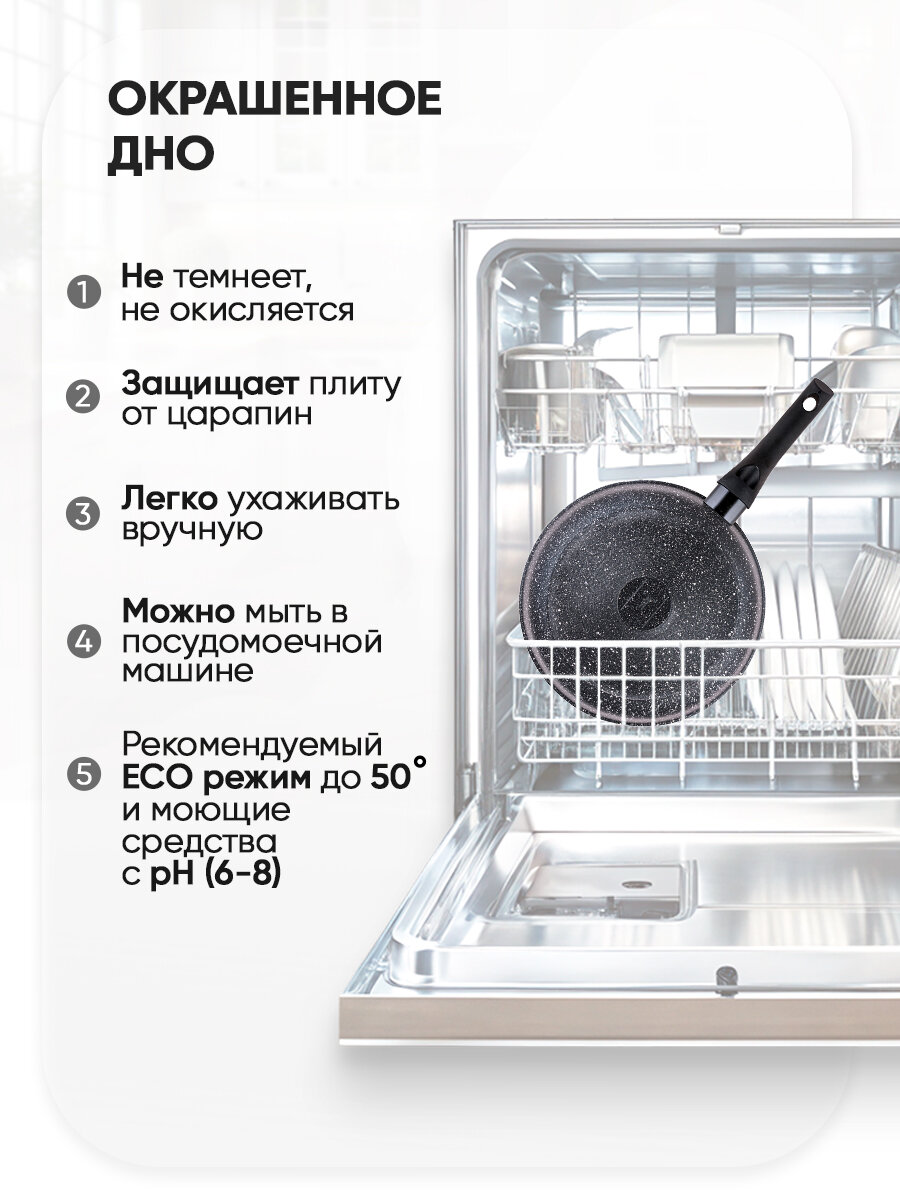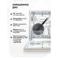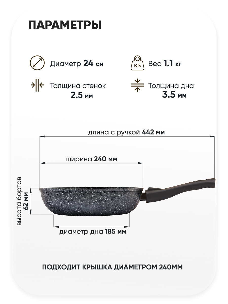 Сковорода подходит для всех типов плит, имеет утолщенное дно 4 мм для равномерного прогрева и высокие бортики 5 см для удобства приготовления