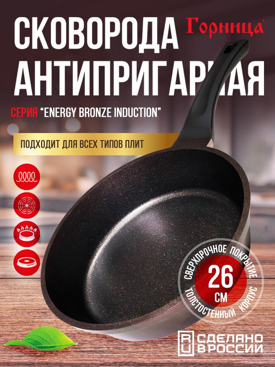 Купить Сковорода антипригарная литая 26см ENERGY Bronze Induction ТМ Горница с доставкой по всей России. Сковорода антипригарная литая 26см ENERGY Bronze Induction ТМ Горница: сравнение цен, характеристики, фото, актуальное наличие и цены.
