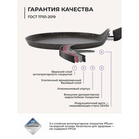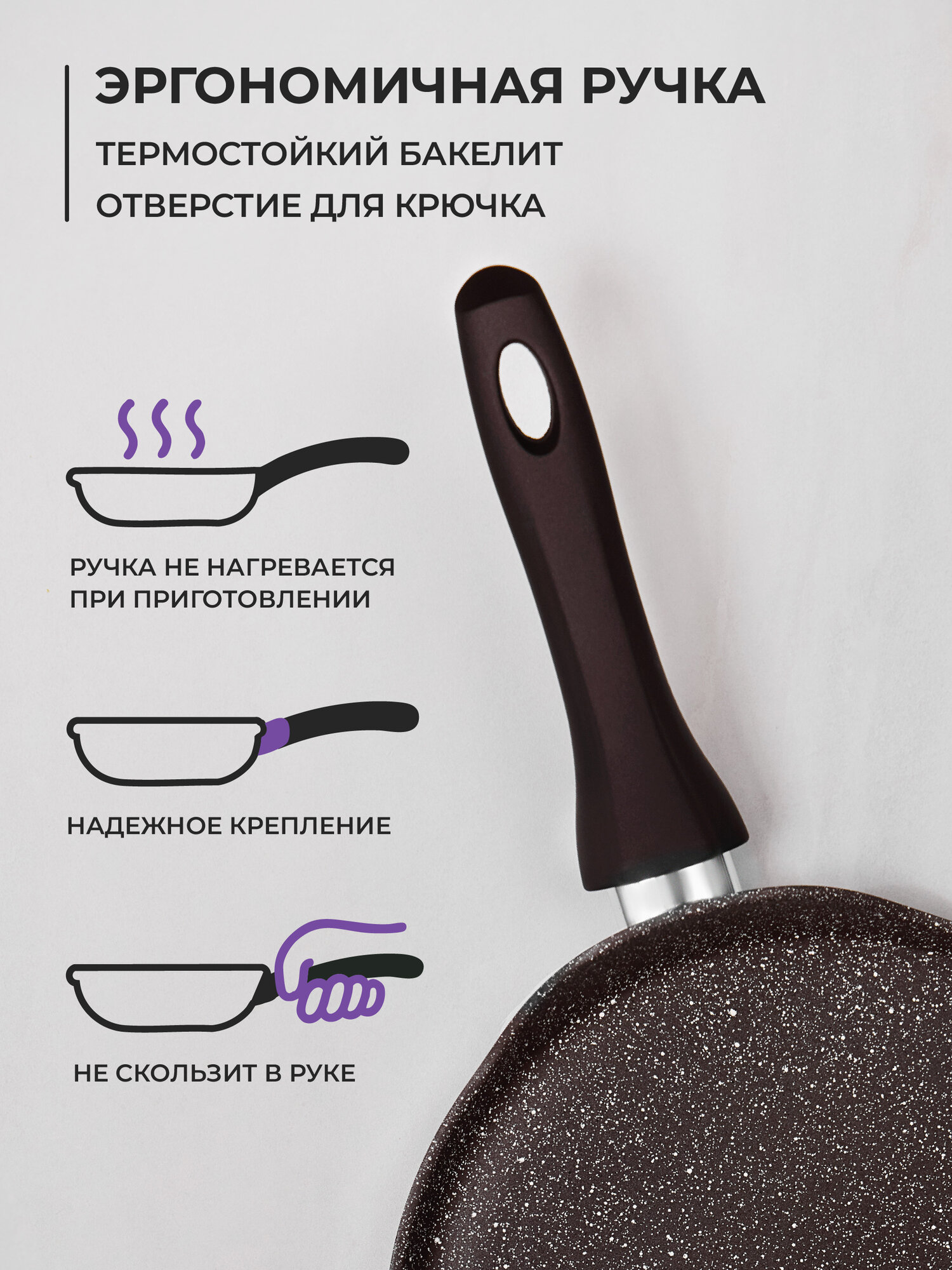 Жаропрочная бакелитовая ручка обеспечивает высокую прочность и позволяет удерживать сковороду на весу со всем содержимым. Эргономичный дизайн ручки обеспечивает комфортное использование сковороды, особенно при активном приготовлении пищи.