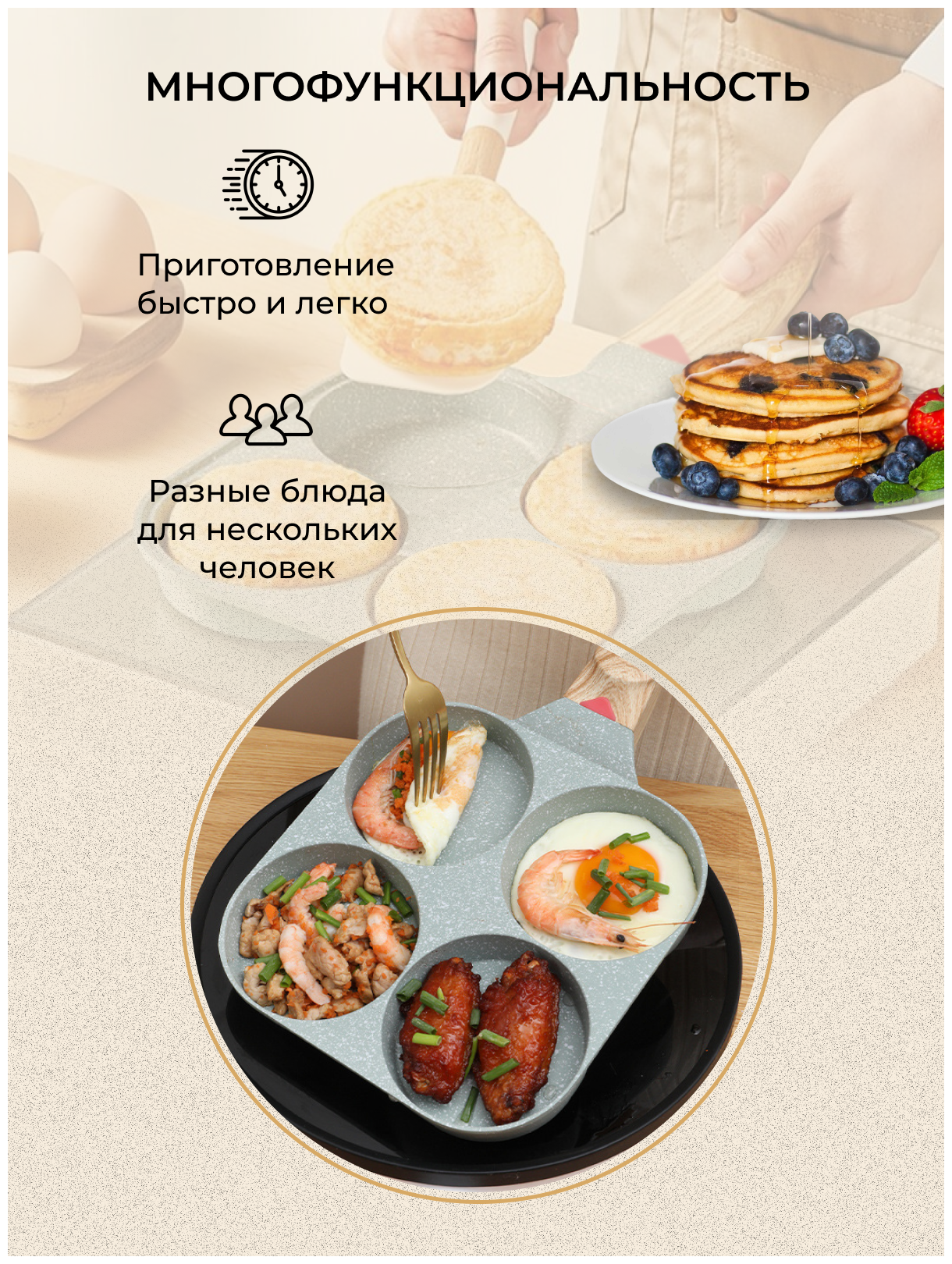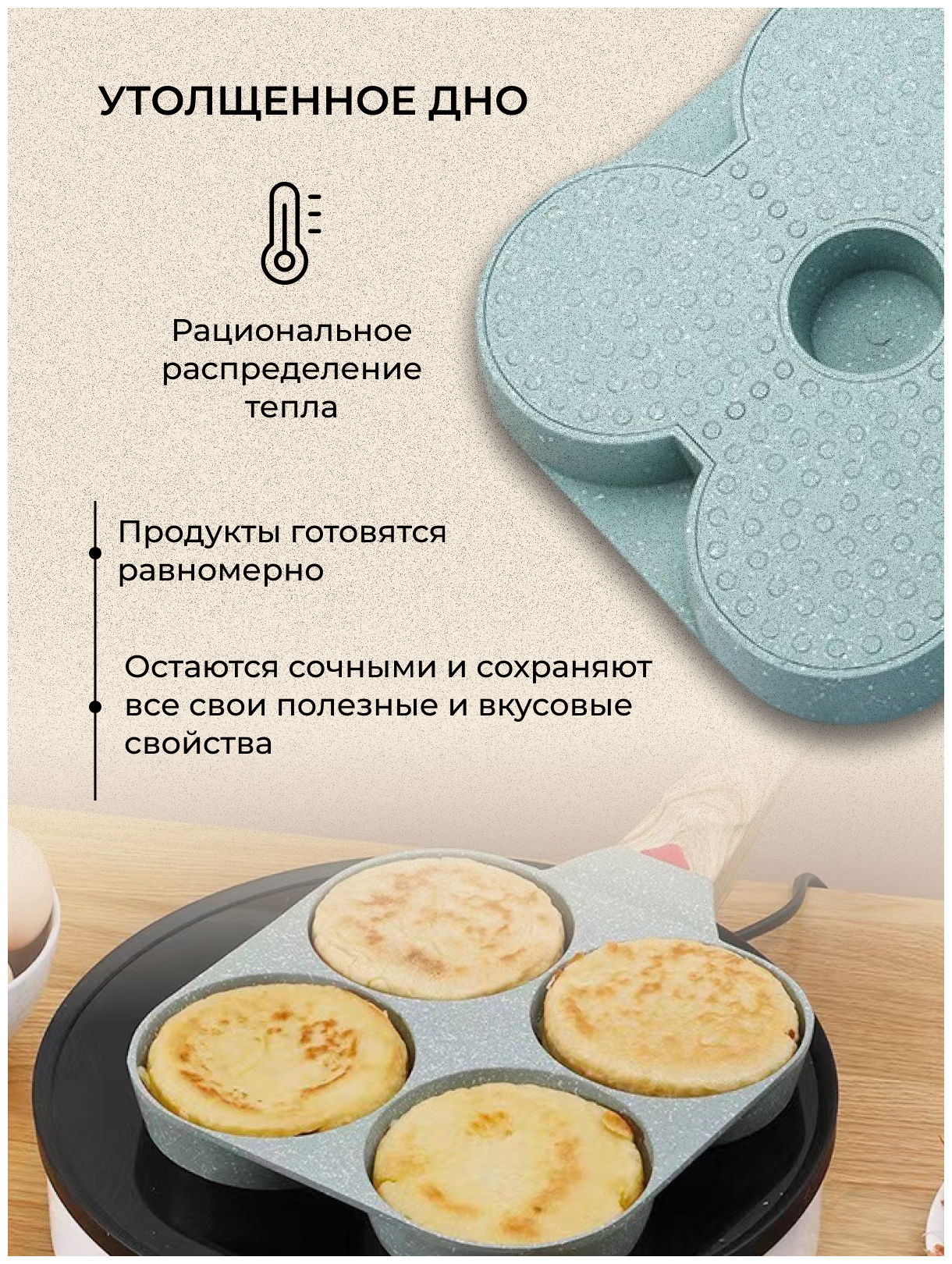 Сковорода блинная глубокая из литого алюминия с антипригарным каменным и мраморным покрытием. Блинница с высокими бортами квадратная для индукционной, газовой, электрической плиты идеально подходит для приготовления яичницы, блинов, оладий, глазуньи, омлета, панкейков, пиццы, мучных изделий, детских блюд. Маленькая, с отсеками, идеальный компактный мини размер 20см с толстым дном. Отсеки маленького диаметра, имеет квадратную форму и фигурный вид, где можно приготовить порционное блюдо, а материал покрытия позволяет жарить еду без масла. Легко моется, не царапается, можно брать с собой в поход, удобна для приготовления завтрака. Секции имеют необычную форму, что позволяет продукту придать необычный вид вашему блюду, будь то глазунья или оладушек. Наша сковорода подходит для любых типов плит, включая индукционную, более того сковороду можно использовать для приготовления блюд в духовке. Многофункциональная, секционная сковорода - то, что должно быть у каждой хозяйки! Сковорода с несколькими отсеками позволяет готовить одновременно несколько блюд: яйца, оладьи, панкейки, котлеты, сырники, картошку, колбасу и многое другое - все что душе угодно и все это на одной сковороде. Можно удовлетворить вкусовые потребности всей семьи одновременно. Наша сковорода позволит сэкономить время на приготовление завтрака, обеда или ужина. Сковорода с антипригарным покрытием, легко моется, так же ее можно мыть в посудомоечной машине. На данной сковороде ручка из бакелита (термостойкой пластмассы). Её основные плюсы в том, что она не нагревается, не скользит, обеспечивая удобный хват. Наша сковорода подходит для любых типов плит, включая индукционную, более того сковороду можно использовать для приготовления блюд в духовке. В подарок к каждому заказу набор из 3 кухонных предметов: Кисточка, 2 лопатки.