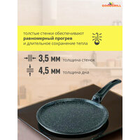 Сковорода для блинов с антипригарным покрытием GOODGRILL- это идеальная посуда для дома, с которой вы почувствуете себя настоящим искусным поваром. Сковороды с антипригарным покрытием гарантируют легкость приготовления вкусной, здоровой пищи и простоту ухода за посудой. Выбирая наши сковородки, вы получаете высококачественный продукт, произведенный в соответствии с ГОСТ из пищевого алюминия с литым корпусом и толстым дном для равномерного прогрева и длительного сохранения тепла. Наши блинницы имеют прочное трехслойное антипригарное покрытие на водной основе GREBLON, абсолютно безопасное в использовании даже в случае его повреждения. Сковороды получили специальную проточку дна для ускоренного нагрева изделия и снабжены жаропрочной, эргономичной ручкой с противоскользящим покрытием Soft-touch. Посуда GOODGRILL станет хорошим подарком близким людям на любой праздник. Приятного аппетита!
