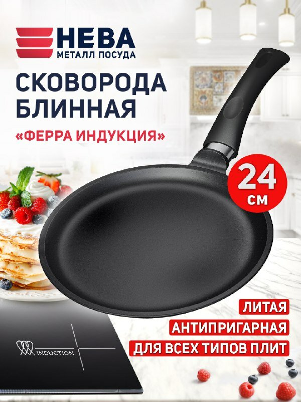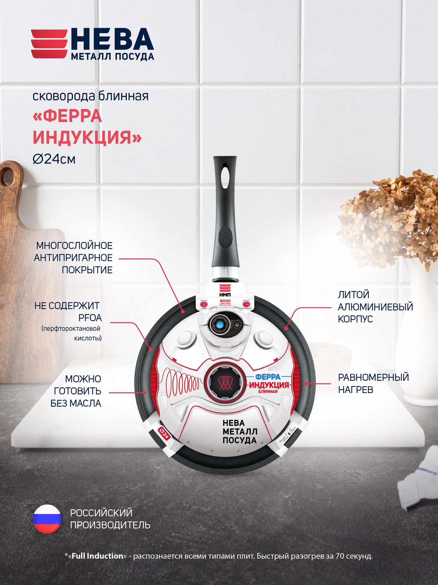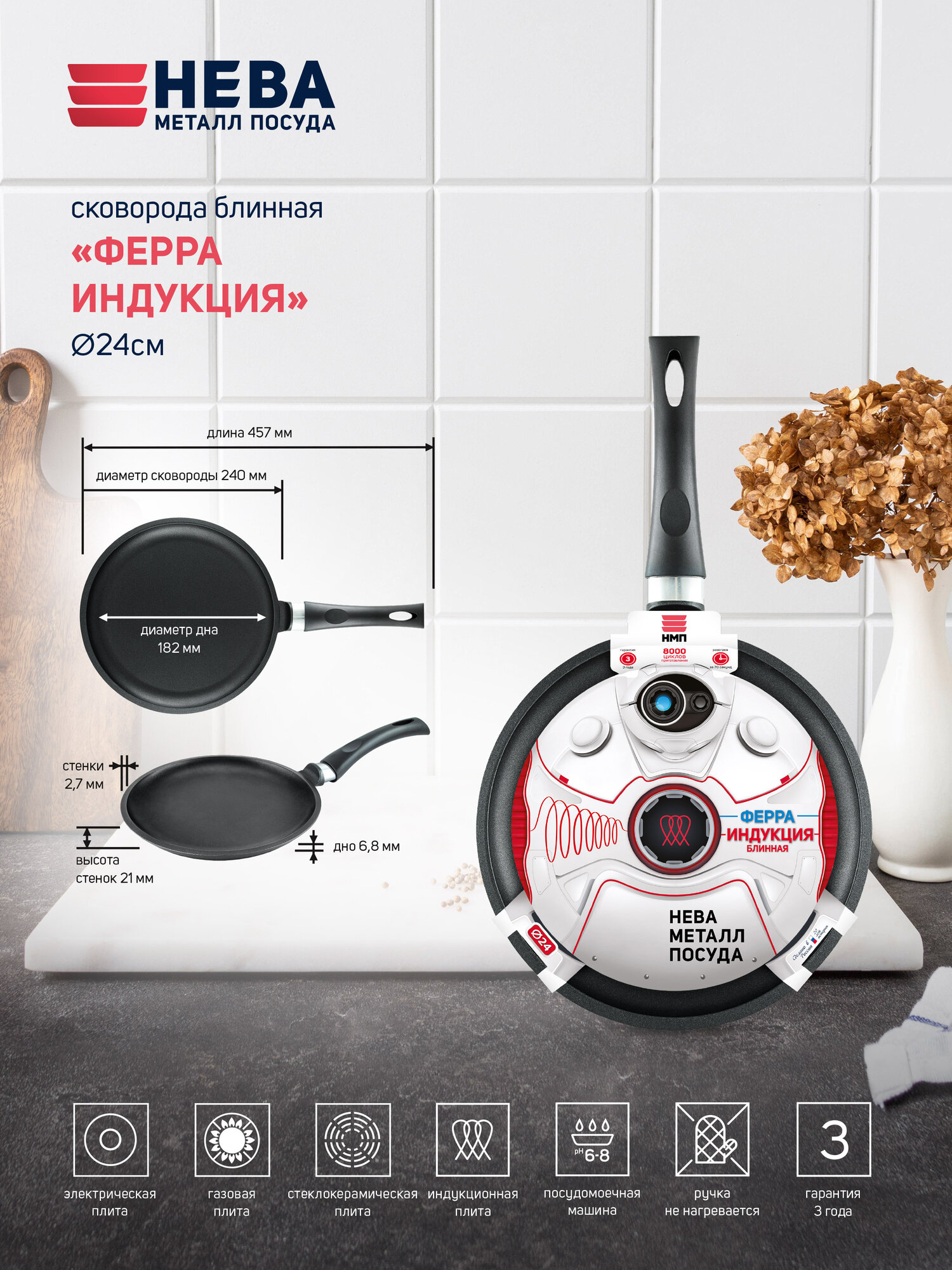 Cковорода для блинов 24 см Нева Металл Посуда Ферра Индукция, с антипригарным покрытием, блинная, алюминиевая, для индукционной плиты: сравнение цен, характеристики, фото, актуальное наличие и цены.