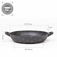Диаметр 28 см. Высота 6 см. Толщина стенки 4 мм. Вес изделия 3,2 кг.