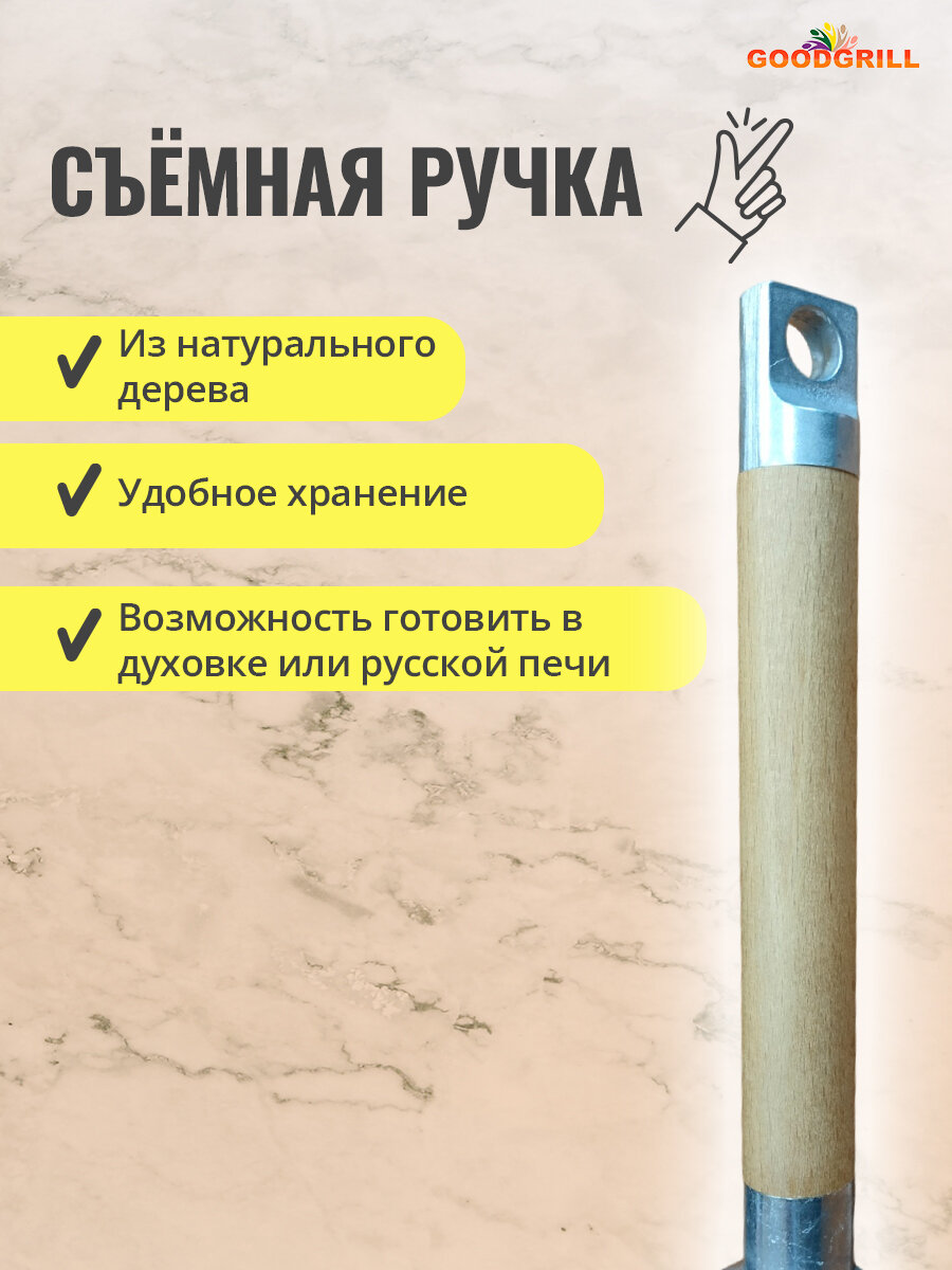 Чугунные сковороды GOODGRILL являются неотъемлемым атрибутом любой кухни, поскольку подходят для всех типов плит и обладают своими преимуществами перед другими видами посуды для жарки. В них можно обжаривать мясные и рыбные продукты, пассеровать овощи, они отлично справляются с тушением любых блюд. От обычных сковород отличаются скоростью и высоким качеством тушения. Такой эффект создается за счет толстых стенок и дна с большой рабочей поверхностью. Тепло распределяется постепенно и равномерно, что позволяет блюду, не подгорая, хорошо тушиться. Удобная деревянная съемная ручка снабжена надежной системой крепления: при помощи вращательного движения ручка снимается и прикручивается. Благодаря съемной ручке сковороду можно поставить в холодильник или поместить в небольшой кухонный шкаф. Деревянная ручка не нагревается. Чугунная посуда GOODGRILL изготовлена в соответствии с ГОСТ из высококачественного материала, прошедшего все необходимые испытания. Это обеспечивает её длительную и безопасную эксплуатацию. Чугунная сковорода GOODGRILL упакована в надежную картонную коробку с инструкцией. Чугун является экологически чистым металлом. Наши предки предпочитали исключительно чугунную посуду. Семейными рецептами вкуснейших блюд с удовольствием будут пользоваться, вспоминая Вашу дальновидность, и Ваши правнуки. Такая посуда выдержит все ваши кулинарные эксперименты, и будет служить десятки лет. Приятного всем аппетита! Посуда из чугуна станет хорошим подарком. Ее можно преподнести бабушке, дедушке, маме, дочери, мужу, любимому, любимой, молодому человеку, девушке, на Новый год, годовщину свадьбы, 8 марта и любой другой праздник.