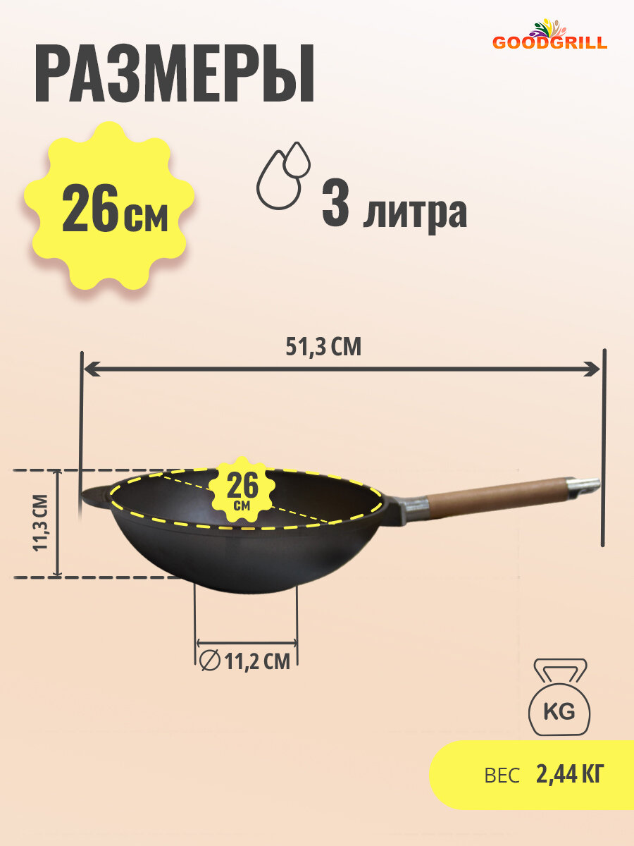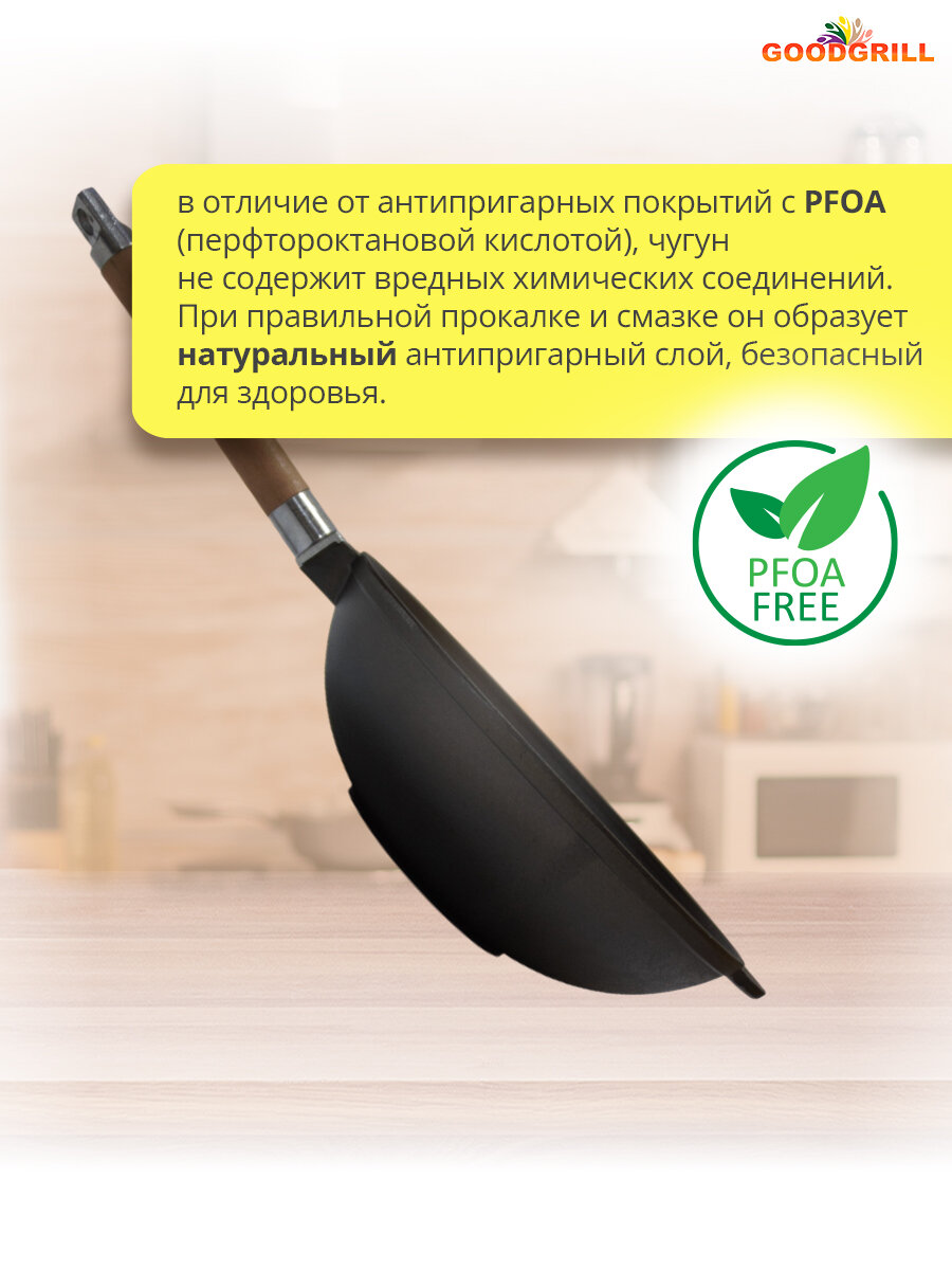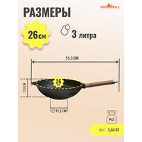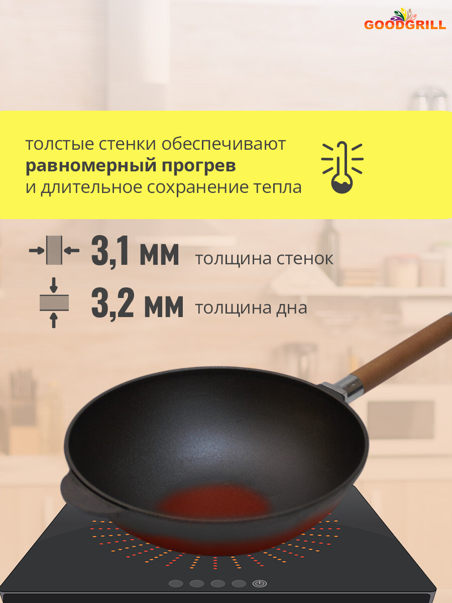 Чугунные сковороды Вок GOODGRILL являются неотъемлемым атрибутом любой кухни, поскольку подходят для всех типов плит и обладают своими преимуществами. В них можно обжаривать мясные и рыбные продукты, пассеровать овощи, готовить супы, каши, плов, они отлично справляются с тушением любых блюд. От обычных сковород отличаются скругленным дном, что способствует быстрому нагреванию на мангале или костре. WOK имеет литые ручки, его можно использовать в духовке. Благодаря толстым стенкам и дну тепло распределяется постепенно и равномерно, что позволяет блюду, не подгорая, хорошо жариться и тушиться. Универсальная форма Вок может заменить казан, сотейник, жаровню. Сковорода Вок может использоваться как дома, так и на даче, пикнике, в туристических походах. Чугунная посуда GOODGRILL изготовлена по ГОСТ из высококачественного материала, прошедшего все необходимые испытания. Это обеспечивает её длительную и безопасную эксплуатацию. Сковороды WOK GOODGRILL упакованы в надежную картонную коробку с инструкцией. Чугун является экологически чистым металлом. Наши предки предпочитали исключительно чугунную посуду. Такая посуда выдержит все ваши кулинарные эксперименты, и будет служить десятки лет. Приятного всем аппетита! Посуда из чугуна станет хорошим подарком. Ее можно преподнести бабушке, дедушке, маме, дочери, мужу, любимому, любимой, молодому человеку, девушке, на Новый год, годовщину свадьбы, 8 марта и любой другой праздник.