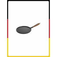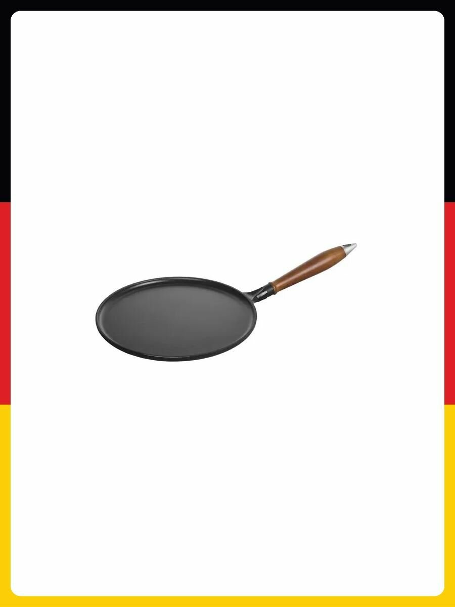 Сковорода для блинов черная, с деревянной ручкой, 28 см, с приспособлением для размазывания теста, Staub артикул: 1212823материал: чугун Изготовлена из чугуна, покрытого эмалью снаружи и внутри. Подходит для использования на всех типах плит. Эмалированный чугун представляет собой сплав железа, богатого углеродом, покрытый эмалью, состоящей главным образом из стекла. Этот материал обладает одними из лучших теплоудерживающих свойств, медленно распространяет и абсолютно равномерно распределяет тепло на огне любого типа, включая индукционную плиту. Эмалированная черная матовая внутренняя поверхность Staub Внутренняя поверхность – черная матовая эмаль из специального составаЧугунНаружная поверхность – не менее двух слоев цветной эмали Внутренняя поверхность всех изделий Staub покрыта черной матовой эмалью. Эта высококачественная эмаль обеспечивает повышенную сопротивляемость тепловым ударам и царапинам, а также простоту в обращении. Она обладает идеальными качествами для обжаривания, поджаривания и карамелизации продуктов. Нашу продукцию выбирают и любители, и самые знаменитые шеф-повара. Благодаря эмали продукты не пригорают; при первом использовании изделие не нужно прокаливать. Легко чистятся, удобны в использовании. Производитель: Франция.