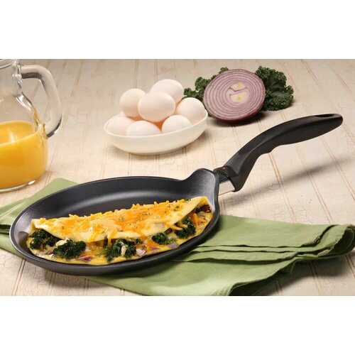 Сковорода диаметром 24 см с низкими бортиками - предназначена для приготовления блинов, а также идеально подходит для приготовления омлетов и французских тостов. Особая форма бортиков позволяет легко перевернуть блюдо и облегчает сервировку. Сковорода оснащена сбалансированной фиксированной рукояткой с отверстием для подвешивания. Корпус выполнен из сплава алюминия и кремния методом литья под высоким давлением с последующей пескоструйной шлифовкой и плазменным напылением для усиления адгезии внешнего покрытия, рукоятка – из термостойкого бакелита. Подходит для индукции.