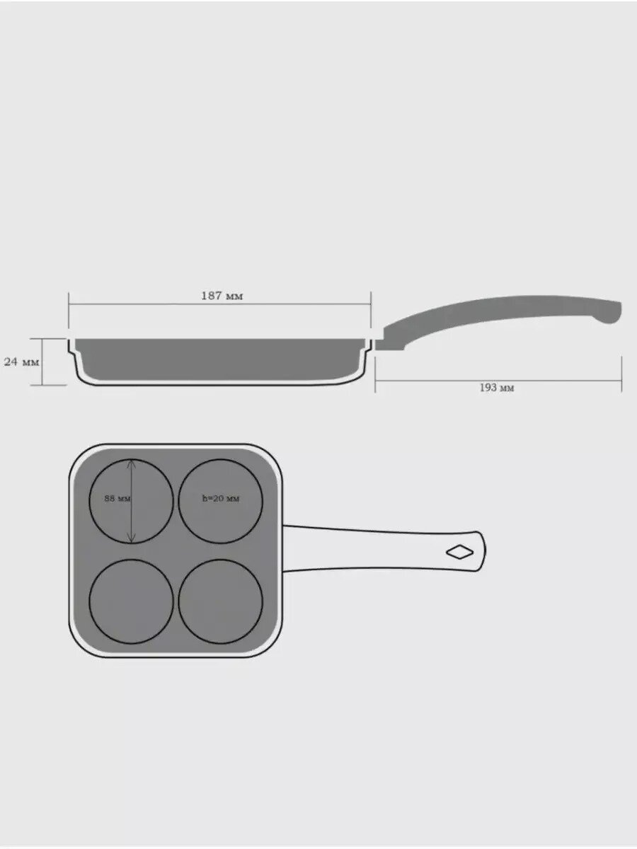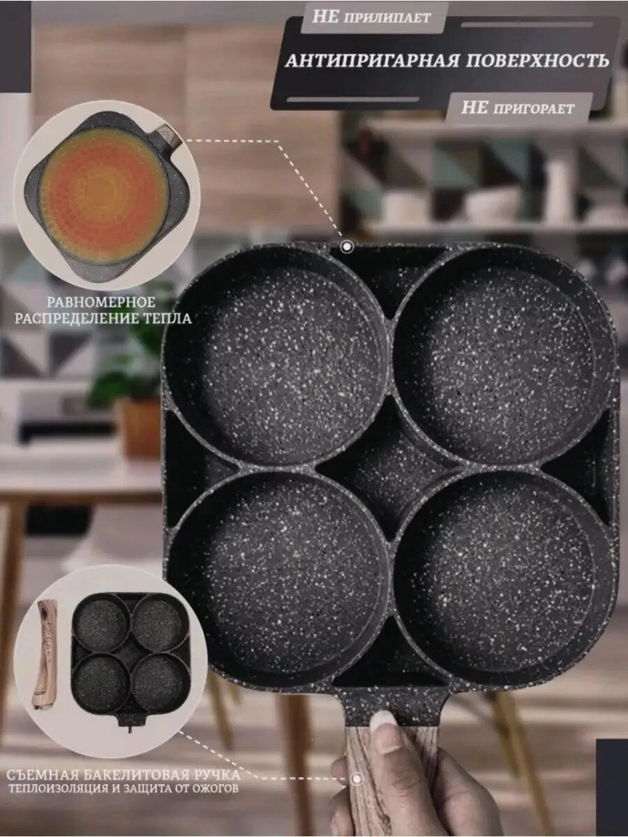 Наша сковорода с четырьмя отверстиями специально сделана для удобства приготовления быстрых блюд и перекусов — омлет, яичница, блины, различные мясные продукты все что нужно для быстрого и здорового завтрака. Каждый отсек является монолитной частью, однако дно само по себе единое, для удобства пользования. Подходит для любых плит будь то газовая или индукционная.