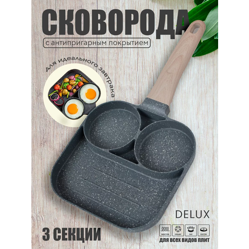 Сковорода секционная для завтрака незаменимая помощница каждой хозяйки. Маленькая сковородка для яичницы с секциями позволит вам одновременно приготовить разные виды продуктов и подать ваш идеальный завтрак своим родным и близким. Антипригарное покрытие позволит легко и быстро приготовить любимые завтраки, керамическое покрытие не требует особого ухода. Антипригарная сковородка с отделами экономит место на вашей кухне. Маленькая сковородка с отделами имеет эргономичную съемную ручку для удобного хранения. Сковорода для завтрака подходит для всех видов плит (газовая, индукционная, электрическая, керамическая). Сковорода с несколькими отделами станет прекрасным подарком маме, сестре, хозяйке на Новый год, день рождение и любой праздник. Сковорода для яичницы и оладий упакована в эстетичную коробку и имеет небольшой размер.