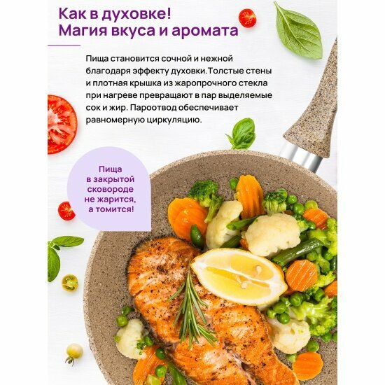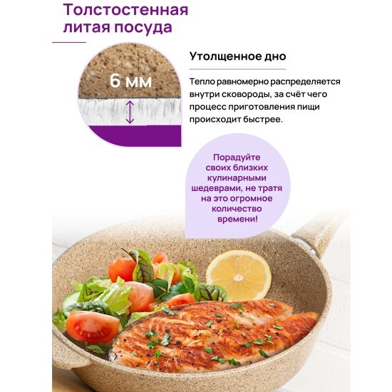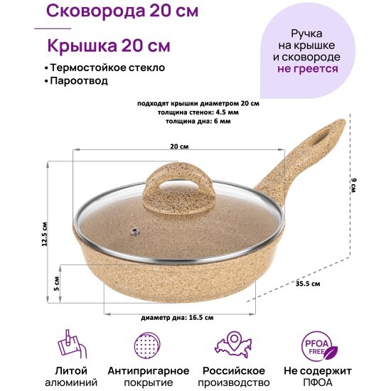 Глубокая сковорода Elan Gallery "Медовый гранит" из серии "Гармония вкуса" диаметром 20 см с крышкой равномерно разогревается и распределяет тепло таким образом, что продукты в ней сохраняют свои полезные свойства, сочность и вкус. Диаметр дна сковороды — 16,5 см. Стильный дизайн, имитирующий гранит, подойдет к любому интерьеру вашей кухни. Сковорода с глубоким дном выполнена из толстостенного литого алюминия и имеет ультрапрочное двухслойное антипригарное покрытие Cookmark. Оно устойчиво к царапинам и износу, полностью безопасно для здоровья и не содержит PFOA или других вредных веществ. Сковороду можно использовать для жарки с минимальным количеством масла для приготовления здоровой пищи, что оценит любой гурман. Готовьте дома любимые стейки, они сохранят свою сочность, нежность и аромат! Сковорода подходит для приготовления блюд из рыбы, мяса, овощей, а также плова. Сковородка станет идеальным помощником для создания завтрака, например: яичницы, омлета, блинов, оладий. Имеет удобную ручку, что обеспечивает надежный захват при подаче еды с плиты на стол. Стеклянная крышка позволит сохранить тепло блюда, защитит от брызг, а также поможет следить за процессом приготовления пищи. Эксплуатация: не нагревать без продуктов. Дайте посуде остыть, прежде чем помещать ее в воду. Использовать только деревянные, силиконовые и пластиковые лопатки без острых краёв. Не мыть абразивными или щелочными моющими средствами. Использовать в посудомоечной машине только в режиме "Эко" с использованием средств, не содержащих щелочи. Подходит для всех типов плит, кроме индукционных. Сковорода станет идеальным подарком для женщин и придаст процессу приготовления пищи новый уровень комфорта. Подарите такую универсальную вещь маме, подруге, сестре или тёте. Хорошая сковорода – мечта любой хозяйки!