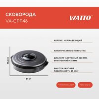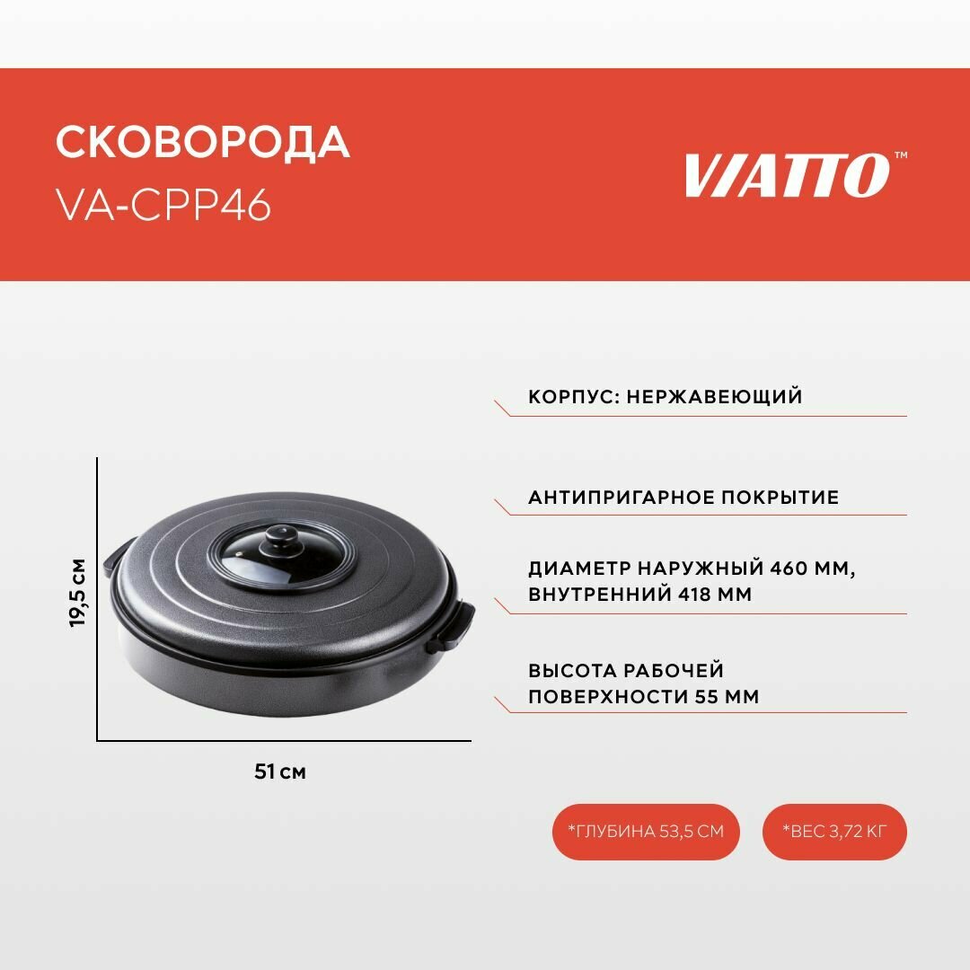 Сковорода электрическая VIATTO VA-CPP46 предназначена для приготовления пиццы, жарки, тушения и разогрева блюд на предприятиях общественного питания и торговли, а также в кафе, ресторанах, фаст-фуд заведениях. Электросковорода оснащена терморегулятором и имеет антипригарное покрытие. Регулировка температуры у сковороды позволяет жарить продукцию с различной рецептурой. Сковорода настольная для обеспечения высокой производительности снабжена мощными нагревательными элементами, а для эксплуатации в производственных условиях оснащена нержавеющим корпусом. Благодаря мощности электрической сковороды в 1600 Вт еда готовится и разогревается в кратчайшие сроки. Крышка со стеклянной вставкой и жаропрочные ручки облегчат и сделают безопасным процесс приготовления блюд, которые требуют частого перемешивания. Увеличенная глубина дает возможность использовать сковороду для выпечки пиццы, пирогов, запеканок. Сковорода с антипригарным покрытием имеет быстрый равномерный нагрев и длительное удержание тепла. Основные характеристики: • Терморегулятор • Антипригарное покрытие • Диаметр: наружный — 460 мм, внутренний — 418 мм. Глубина 55 мм • Крышка со стеклянной вставкой • Температурный режим +100.+250 °C