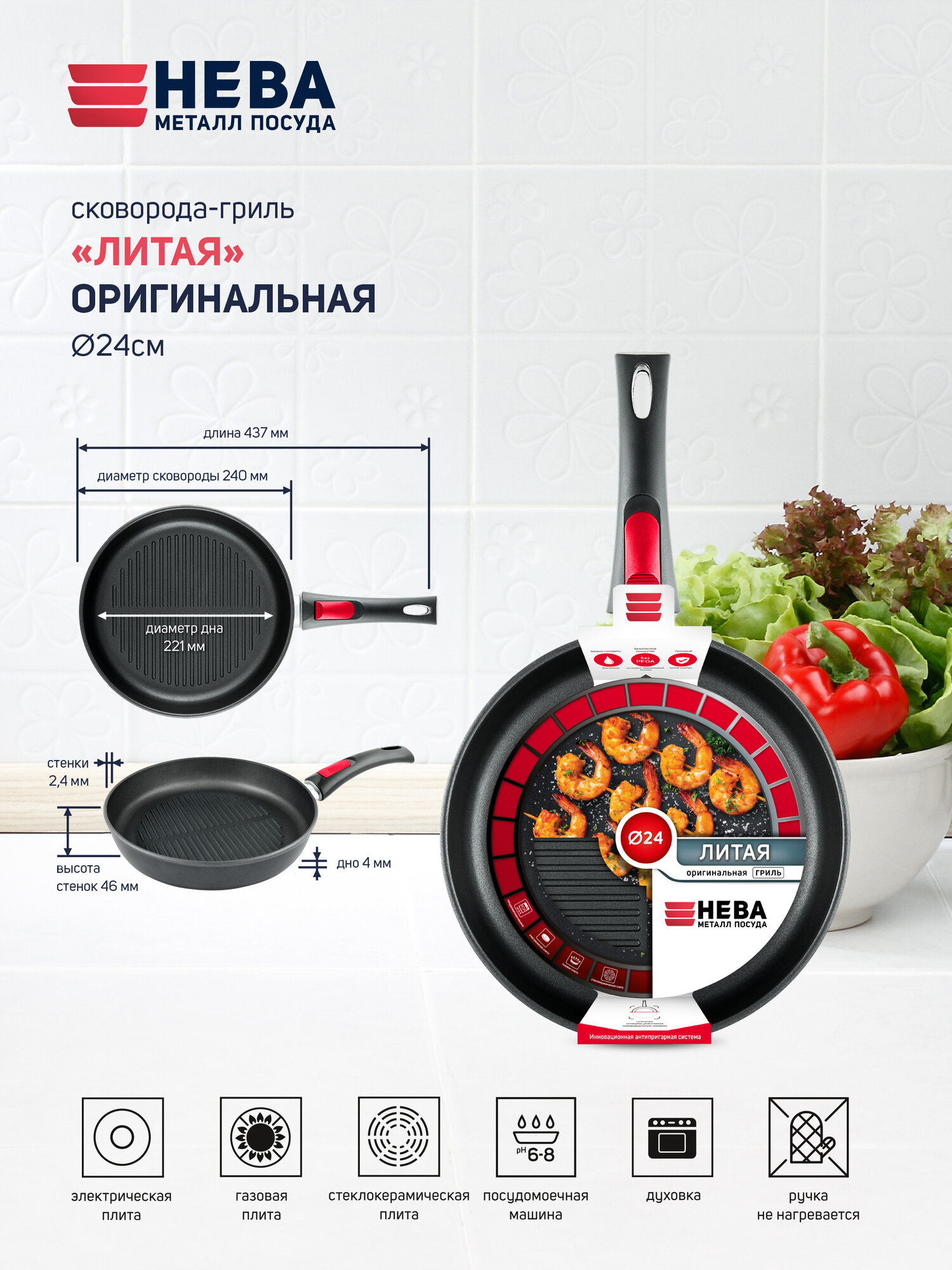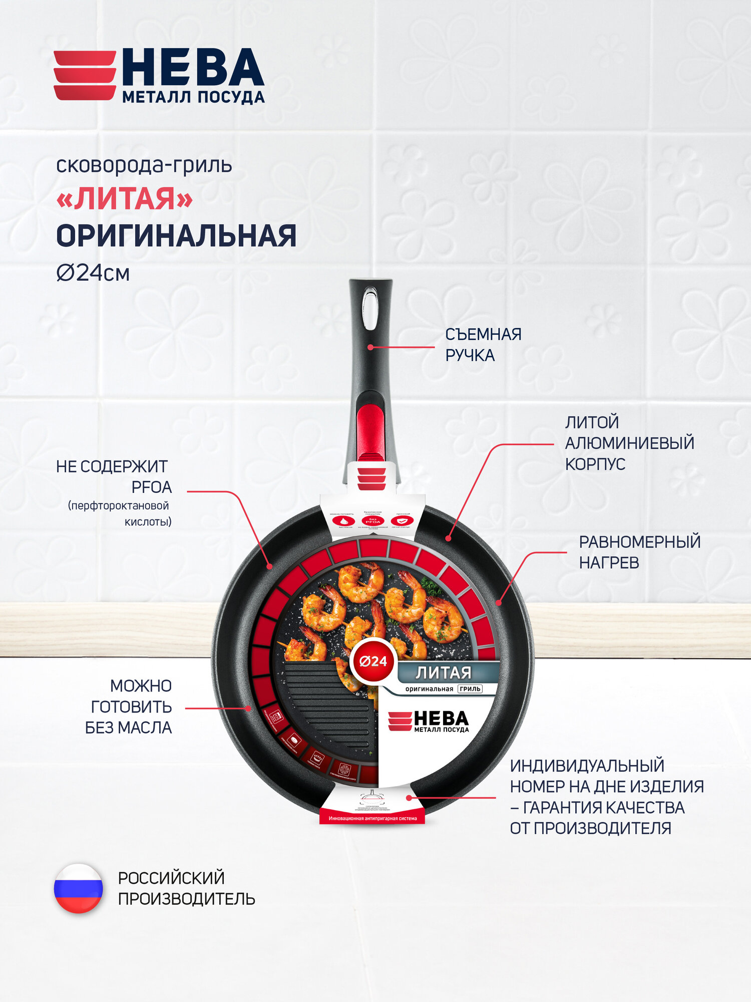 Сковорода — гриль 24 см (сотейник) литая с антипригарным покрытием Нева Металл Посуда Литая «Оригинальная» с съемной ручкой и без крышки: сравнение цен, характеристики, фото, актуальное наличие и цены.