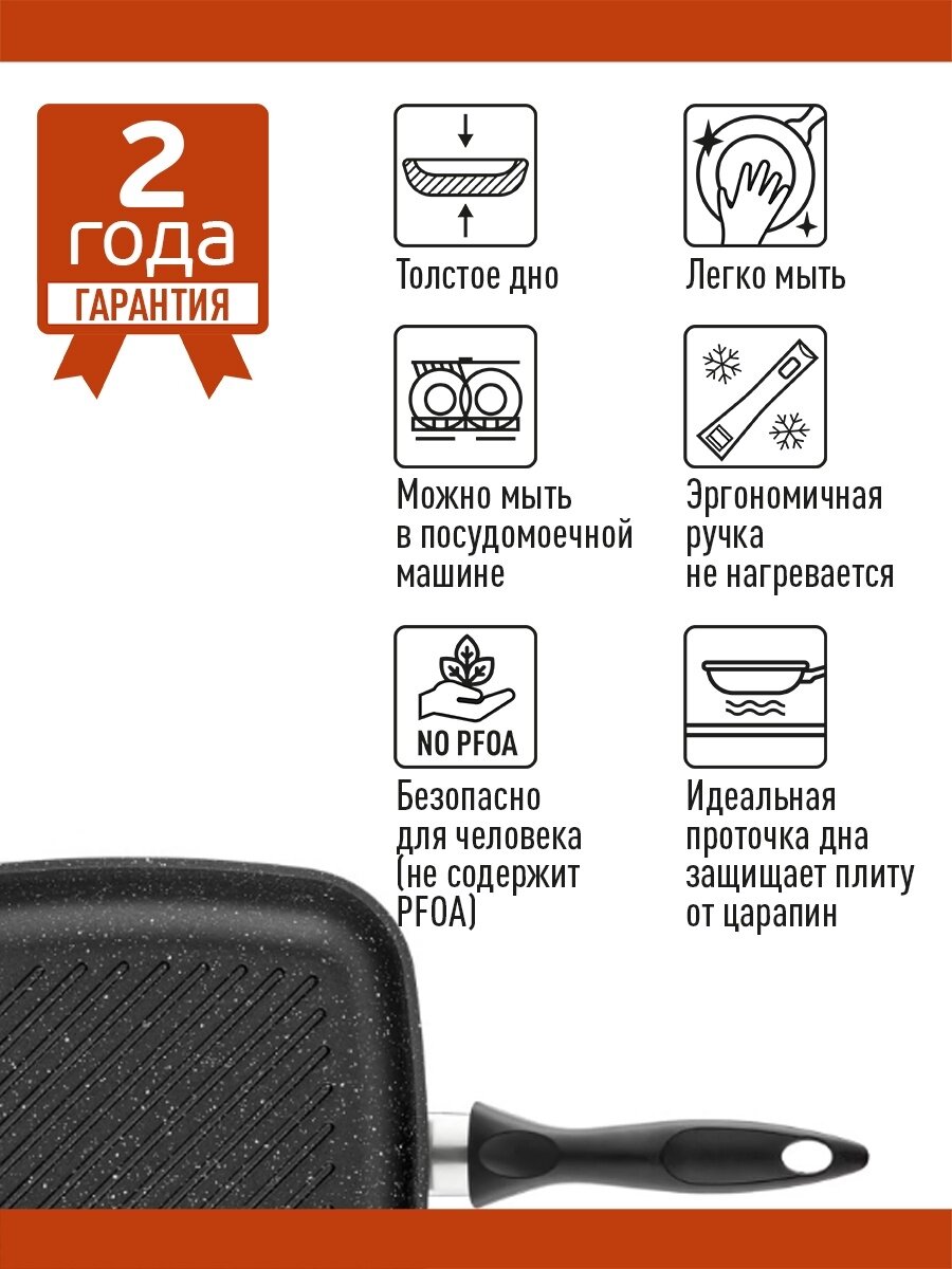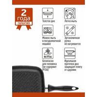 Квадратный массивный корпус с высокими бортами и утолщенным дном долго держит тепло и создает эффект чугунной сковороды. Алюминиевая сковорода понравится любителям жарки, ведь антипригарное покрытие сковороды обладает жаропрочными свойствами, благодаря чему идеально хорошо получатся стейки. Сковородка хорошо подходит для мяса, рыбы, птицы и овощей.